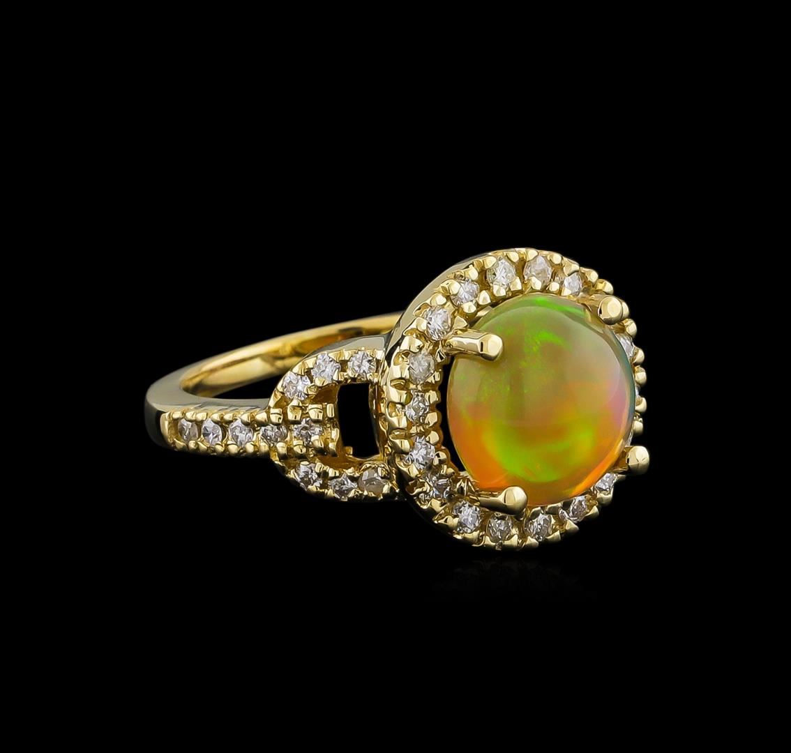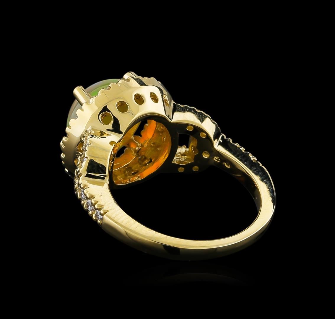 One electronically tested 14KT yellow gold lady's cast fashion ring with a halo with a bright polish finish. The featured lady's ring has a shank measuring 1.93 millimeters wide. Identified with markings of "K14". Condition is new, good workmanship. Containing: One orange opal that is cut in a round shaped cabochon and is prong set, measuring 10.03 mm long x 10.01 mm wide, and 5.23 mm thick and the approximate weight is 2.56 carats. The opal has a quite bright, green-orange play of color (fire) in a rolling flashfire pattern; a medium dome; a very good cut; no inclusions; consistent in its brightness and pattern; and is not directional. Graded in the setting. Eighteen prong set round brilliant cut diamonds, measuring 1.70 - 1.60 x 1.02mm (depth est.) approximate total weight of 18 Stones = 0.32ct. Graded in the setting. Clarity: SI-1 to I-1. Color: H - I. Cut Good Twenty-Two prong set round brilliant cut diamonds, measuring 1.50 - 1.40 x 0.90mm (depth est.) approximate total weight of 22 Stones = 0.26ct. Graded in the setting. Clarity: SI-2 to I-1. Color: H - I. Cut Good. Total Weight of Diamonds 0.58ct. Total Weight of Opals 2.56ct. Total Weight of Ring 7.60gm. GAS Appraised at $3,955.00.