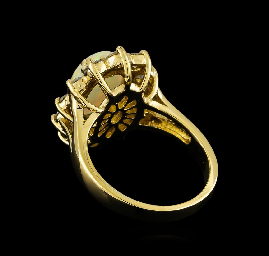 One electronically tested 14KT yellow gold ladies cast opal and diamond ring with a bright polish finish. The featured opal is set within a diamond floret, completed by a two and one-half millimeter wide band. Identified with markings of "14K". Condition is new, good workmanship. Containing: One semi crystal opal that is cut in a oval shaped cabochon and is prong set, measuring 11.90 mm long x 8.10 mm wide, and 4.10 mm thick and the approximate weight is 2.56 carats. The opal has a bright, multicolor play of color (fire) in a flashfire pattern; a medium dome; a good cut; no inclusions; consistent in its brightness and pattern; and is not directional. Graded in the setting. Twelve prong set round brilliant cut diamonds, measuring 3.00 - 3.00 x 1.80mm (depth est.) approximate. Total Weight of 12 Stones = 1.28ct. Graded in the setting. Clarity: SI-2 to I-1. Color: G - I. Total Weight of Diamonds 1.28ct. Total Weight of Opals 2.56ct. Total Weight of Ring 6.89gm. AIG Appraised at $5,635.00.