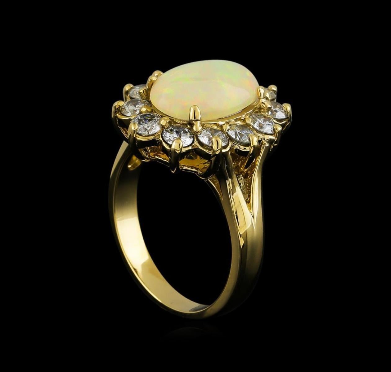 One electronically tested 14KT yellow gold ladies cast opal and diamond ring with a bright polish finish. The featured opal is set within a diamond floret, completed by a two and one-half millimeter wide band. Identified with markings of "14K". Condition is new, good workmanship. Containing: One semi crystal opal that is cut in a oval shaped cabochon and is prong set, measuring 11.90 mm long x 8.10 mm wide, and 4.10 mm thick and the approximate weight is 2.56 carats. The opal has a bright, multicolor play of color (fire) in a flashfire pattern; a medium dome; a good cut; no inclusions; consistent in its brightness and pattern; and is not directional. Graded in the setting. Twelve prong set round brilliant cut diamonds, measuring 3.00 - 3.00 x 1.80mm (depth est.) approximate. Total Weight of 12 Stones = 1.28ct. Graded in the setting. Clarity: SI-2 to I-1. Color: G - I. Total Weight of Diamonds 1.28ct. Total Weight of Opals 2.56ct. Total Weight of Ring 6.89gm. AIG Appraised.