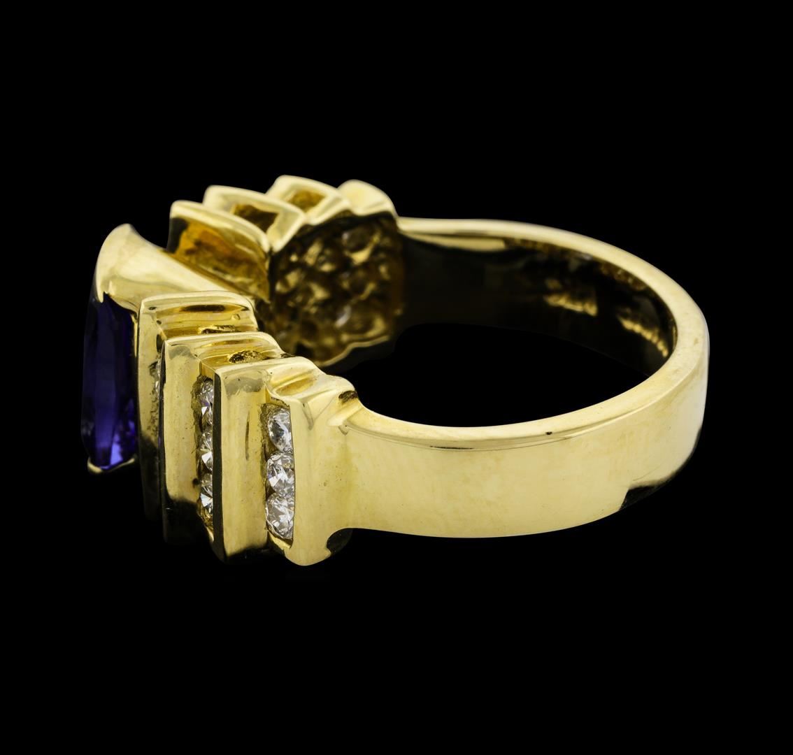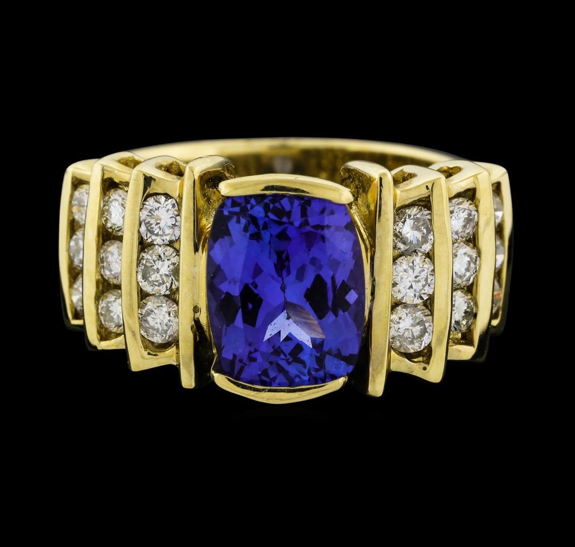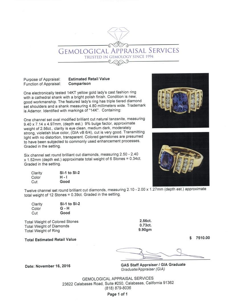 One electronically tested 14KT yellow gold lady's cast fashion ring with a cathedral shank with a bright polish finish. The featured lady's ring has triple tiered diamond set shoulders and a shank measuring 4.80 millimeters wide. Trademark is Adamor. Identified with markings of '14K'. Condition is new, good workmanship. Containing: One channel set oval modified brilliant cut natural tanzanite, measuring 9.40 x 7.14 x 4.97mm, (depth est.) 9%. bulge factor, approximate weight of 2.56ct., clarity is eye clean, medium dark, moderately strong, violetish blue color, (GIA vB 6/4), cut is very good. Transmitting light with no distortion, transparent. Colored gemstones are presumed to have been subjected to commonly used enhancement processes. Graded in the setting. Six channel set round brilliant cut diamonds, measuring 2.50 - 2.40 x 1.52mm (depth est.) approximate total weight of 6 Stones = 0.34ct. Graded in the setting. Clarity SI-1 to SI-2. Color: H - I Cut Good Twelve channel set round brilliant cut diamonds, measuring 2.10 - 2.00 x 1.27mm (depth est.) approximate total weight of 12 Stones = 0.39ct. Graded in the setting. Clarity SI-1 to SI-2. Color: G - H Cut Good. Total Weight of Colored Stones 2.56ct.. Total Weight of Diamonds 0.73ct.. Total Weight of Ring 9.90gm. GAS Appraised at $7,510.00.