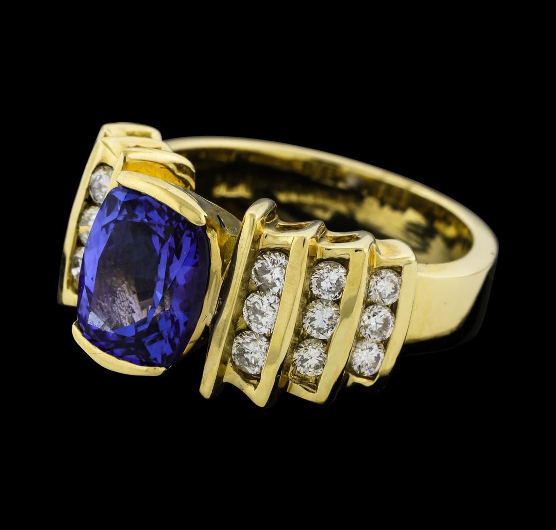 One electronically tested 14KT yellow gold lady's cast fashion ring with a cathedral shank with a bright polish finish. The featured lady's ring has triple tiered diamond set shoulders and a shank measuring 4.80 millimeters wide. Trademark is Adamor. Identified with markings of '14K'. Condition is new, good workmanship. Containing: One channel set oval modified brilliant cut natural tanzanite, measuring 9.40 x 7.14 x 4.97mm, (depth est.) 9%. bulge factor, approximate weight of 2.56ct., clarity is eye clean, medium dark, moderately strong, violetish blue color, (GIA vB 6/4), cut is very good. Transmitting light with no distortion, transparent. Colored gemstones are presumed to have been subjected to commonly used enhancement processes. Graded in the setting. Six channel set round brilliant cut diamonds, measuring 2.50 - 2.40 x 1.52mm (depth est.) approximate total weight of 6 Stones = 0.34ct. Graded in the setting. Clarity SI-1 to SI-2. Color: H - I Cut Good Twelve channel set round brilliant cut diamonds, measuring 2.10 - 2.00 x 1.27mm (depth est.) approximate total weight of 12 Stones = 0.39ct. Graded in the setting. Clarity SI-1 to SI-2. Color: G - H Cut Good. Total Weight of Colored Stones 2.56ct.. Total Weight of Diamonds 0.73ct.. Total Weight of Ring 9.90gm. GAS Appraised at $7,510.00.