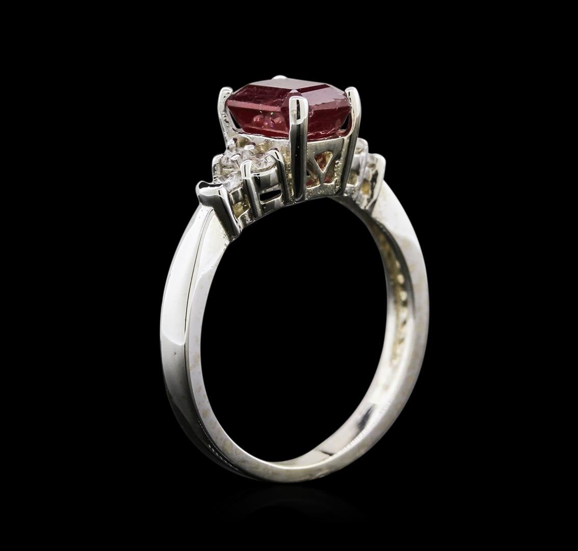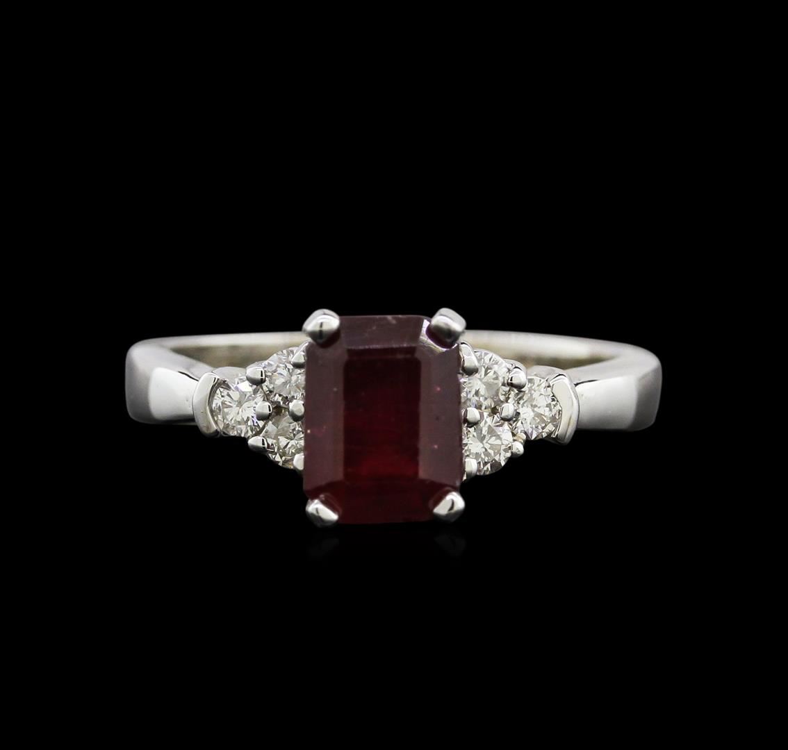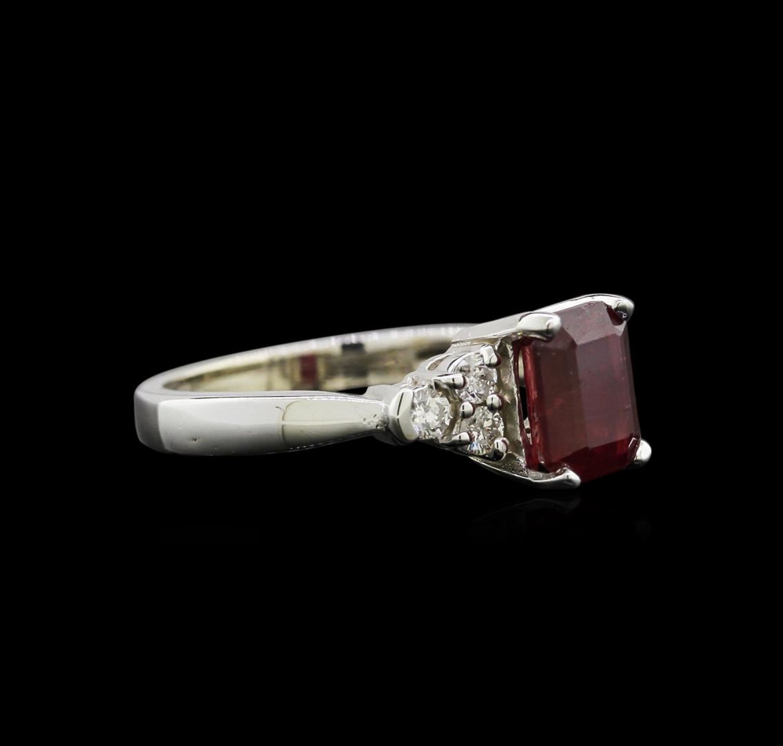 One electronically tested 14KT white gold lady's cast fashion ring with a bright polish finish. The featured lady's ring has a shank measuring 2.40 millimeters wide. Identified with markings of "14K". Condition is new, good workmanship. Containing: One prong set emerald step cut natural ruby, measuring 7.59 x 5.72 x 4.34mm, 15% bulge factor, approximate weight of 2.56ct., clarity is heavily included, type II, dark, very slightly brownish, orangy red color, (GIA oR 7/3), cut is good. Transmitting light somewhat diffusely, semi-transparent to translucent. Colored gemstones are presumed to have been subjected to commonly used enhancement processes. Naturally occurring internal & external characteristics are present. Indications of laboratory high temperature heat treatment, with glass & flux additives. Graded in the setting. Six prong set round brilliant cut diamonds, measuring 2.10 - 2.05 x 1.33mm (depth est.) approximate total weight of 6 Stones = 0.21ct. Graded in the setting. Clarity: SI-1 to I-1. Color: H - I. Cut Good. Total Weight of Colored Stones 2.56ct. Total Weight of Diamonds 0.21ct. Total Weight of Ring 4.10gm. GAS Appraised at $1,930.00.
