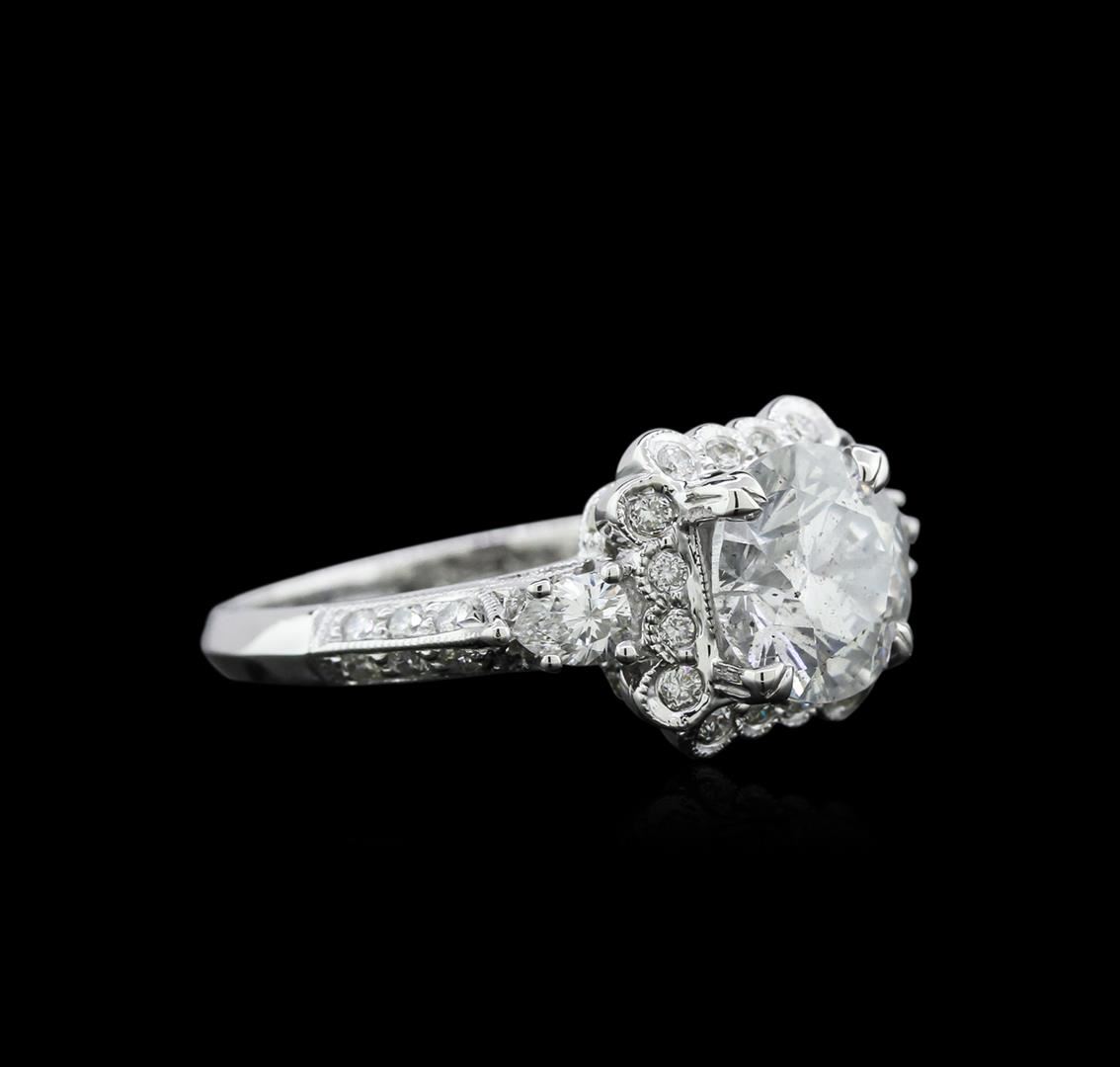 One electronically tested 18KT white gold ladies cast diamond engagement ring with a bright polish finish. Identified with markings of "18K". Condition is new. Containing: One prong set round brilliant cut diamond, measuring 8.17 - 8.17 x 5.08mm (depth est.) approximate weight of 2.07ct. Clarity: I-3. Color: F, Cut is Good. Two prong set pear shaped cut diamonds, measuring 4.00 x 2.00 x 1.80mm (depth est.) approximate total weight of 2 Stones = 0.17ct. Clarity: SI-1. Color: H - I, Cut is Good. Forty-Two prong set round brilliant cut diamonds, measuring 1.30 - 1.30 x 0.78mm (depth est.) approximate total weight of 42 Stones = 0.34ct. Clarity: SI-1 to SI-2. Color: I - J, Cut is Good. Diamonds are graded in the mounting, unless otherwise stated. Total Weight of Diamonds 2.57ct. Total Weight of Engagement Ring 5.80gm. GGL Appraised at $7,055.00.