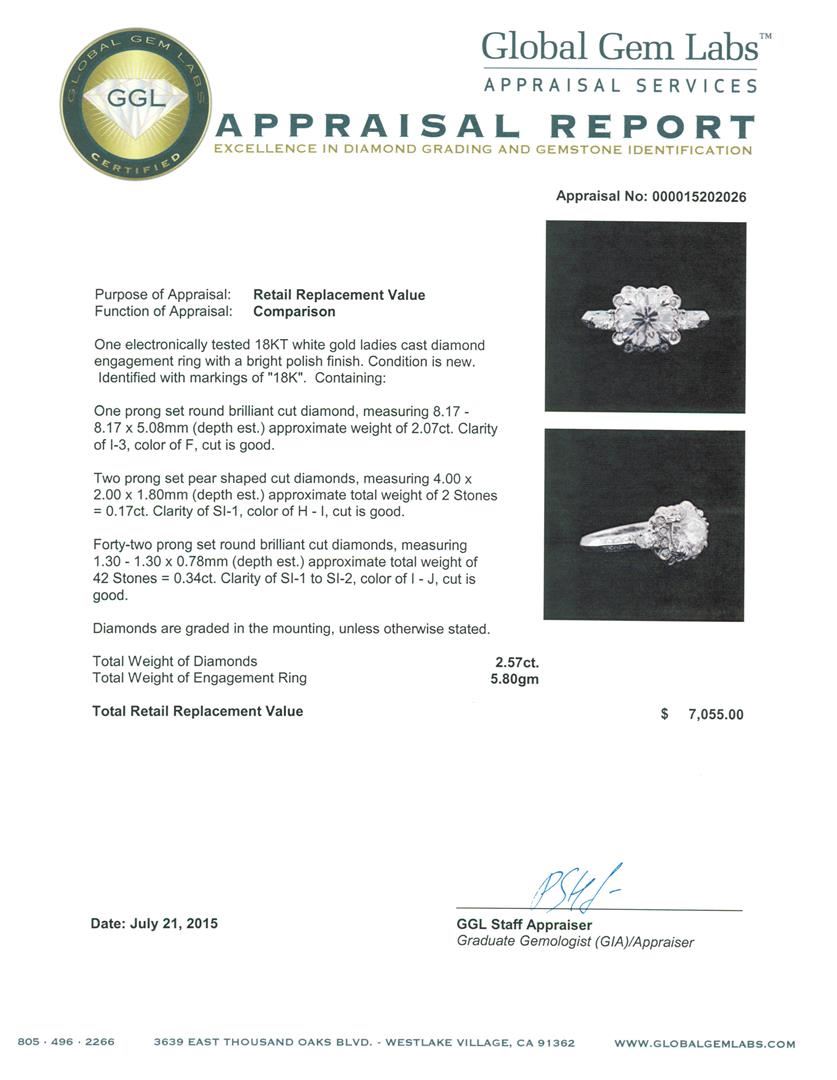 One electronically tested 18KT white gold ladies cast diamond engagement ring with a bright polish finish. Identified with markings of "18K". Condition is new. Containing: One prong set round brilliant cut diamond, measuring 8.17 - 8.17 x 5.08mm (depth est.) approximate weight of 2.07ct. Clarity: I-3. Color: F, Cut is Good. Two prong set pear shaped cut diamonds, measuring 4.00 x 2.00 x 1.80mm (depth est.) approximate total weight of 2 Stones = 0.17ct. Clarity: SI-1. Color: H - I, Cut is Good. Forty-Two prong set round brilliant cut diamonds, measuring 1.30 - 1.30 x 0.78mm (depth est.) approximate total weight of 42 Stones = 0.34ct. Clarity: SI-1 to SI-2. Color: I - J, Cut is Good. Diamonds are graded in the mounting, unless otherwise stated. Total Weight of Diamonds 2.57ct. Total Weight of Engagement Ring 5.80gm. GGL Appraised at $7,055.00.