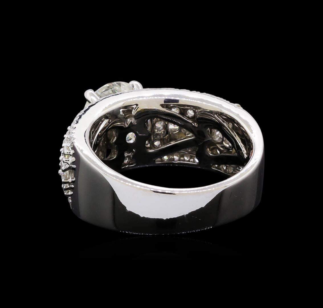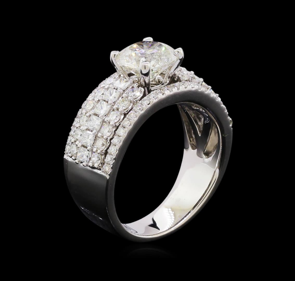 One electronically tested 18KT white gold lady's cast wedding ring with a tapered shank with a bright polish finish. The featured lady's ring has a shank measuring 4.95 millimeters wide. Identified with markings of "18K 750". Condition is new, good workmanship. Containing: One prong set round brilliant cut diamond, measuring 7.38 - 7.36 x 4.56mm (depth est.) approximate weight of 1.51ct. Graded in the setting. Clarity: I-1. Color: G - Very Good Twelve prong set princess cut diamonds, measuring 1.90 x 1.80 x 1.35mm (depth est.) approximate total weight of 12 Stones = 0.45ct. Graded in the setting. Clarity: VS-2 to SI-1. Color: G - Very Good Twenty-Four prong set round brilliant cut diamonds, measuring 1.70 - 1.60 x 1.02mm (depth est.) approximate total weight of 24 Stones = 0.40ct. Graded in the setting. Clarity: SI-1 to SI-2. Color: G - I. Cut Good Forty-Six prong set round brilliant cut diamonds, measuring 1.10 - 1.05 x 0.67mm (depth est.) approximate total weight of 46 Stones = 0.22ct. Graded in the setting. Clarity: SI-1 to SI-2. Color: G - I. Cut Good. Total Weight of Diamonds 2.58ct. Total Weight of Ring 8.00gm GAS Appraised at $20,355.00.