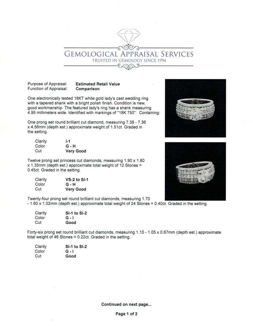 One electronically tested 18KT white gold lady's cast wedding ring with a tapered shank with a bright polish finish. The featured lady's ring has a shank measuring 4.95 millimeters wide. Identified with markings of "18K 750". Condition is new, good workmanship. Containing: One prong set round brilliant cut diamond, measuring 7.38 - 7.36 x 4.56mm (depth est.) approximate weight of 1.51ct. Graded in the setting. Clarity: I-1. Color: G - Very Good Twelve prong set princess cut diamonds, measuring 1.90 x 1.80 x 1.35mm (depth est.) approximate total weight of 12 Stones = 0.45ct. Graded in the setting. Clarity: VS-2 to SI-1. Color: G - Very Good Twenty-Four prong set round brilliant cut diamonds, measuring 1.70 - 1.60 x 1.02mm (depth est.) approximate total weight of 24 Stones = 0.40ct. Graded in the setting. Clarity: SI-1 to SI-2. Color: G - I. Cut Good Forty-Six prong set round brilliant cut diamonds, measuring 1.10 - 1.05 x 0.67mm (depth est.) approximate total weight of 46 Stones = 0.22ct. Graded in the setting. Clarity: SI-1 to SI-2. Color: G - I. Cut Good. Total Weight of Diamonds 2.58ct. Total Weight of Ring 8.00gm GAS Appraised at $20,355.00.