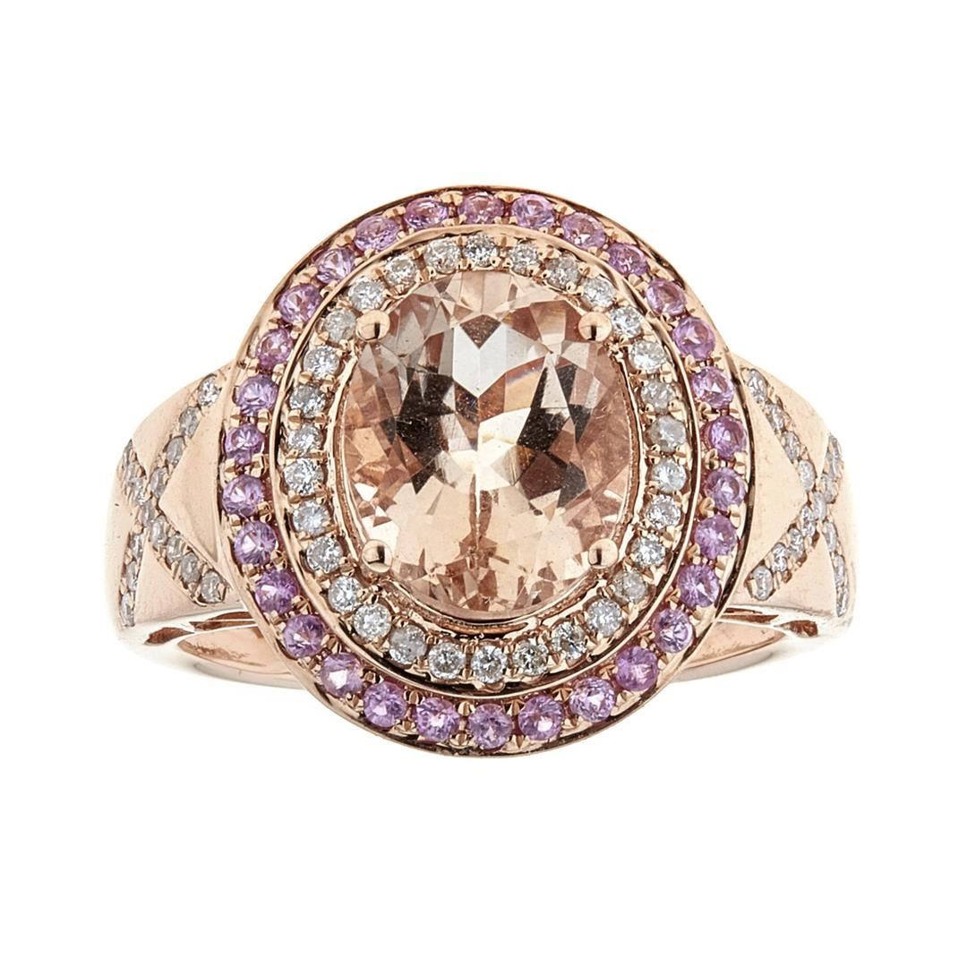 One Lady's Morganite, Pink Sapphire, and Diamond Ring. Setting: 14 Kt. Rose Gold Mounting. Additional: 30 Round Sapphires = 0.30 Cts. TWT (Pink/Transparent) and 60 Round Diamonds = 0.30 Cts. TWT (G-H/SI). Center Gem Stone Information: Species: Natural Beryl. Variety: Morganite. Shape and Cut: Oval Mixed Cut. Measurements: 9.99 x 8.00 x 5.68 mm. Weight: 2.59 Carats. Transparency: Transparent. Color Hue: Orangish Pink. Saturation: Light. Total Weight: 5.39 grams.