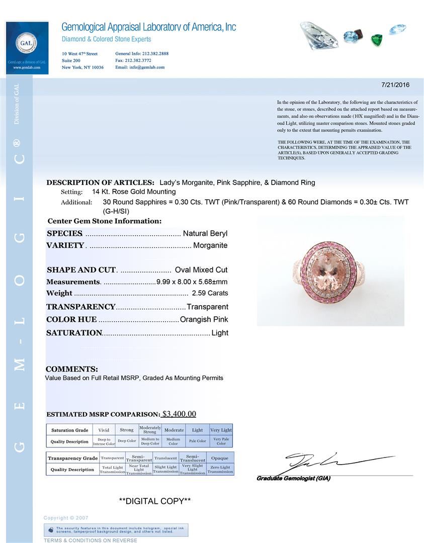 One Lady's Morganite, Pink Sapphire, and Diamond Ring. Setting: 14 Kt. Rose Gold Mounting. Additional: 30 Round Sapphires = 0.30 Cts. TWT (Pink/Transparent) and 60 Round Diamonds = 0.30 Cts. TWT (G-H/SI). Center Gem Stone Information: Species: Natural Beryl. Variety: Morganite. Shape and Cut: Oval Mixed Cut. Measurements: 9.99 x 8.00 x 5.68 mm. Weight: 2.59 Carats. Transparency: Transparent. Color Hue: Orangish Pink. Saturation: Light. Total Weight: 5.39 grams.