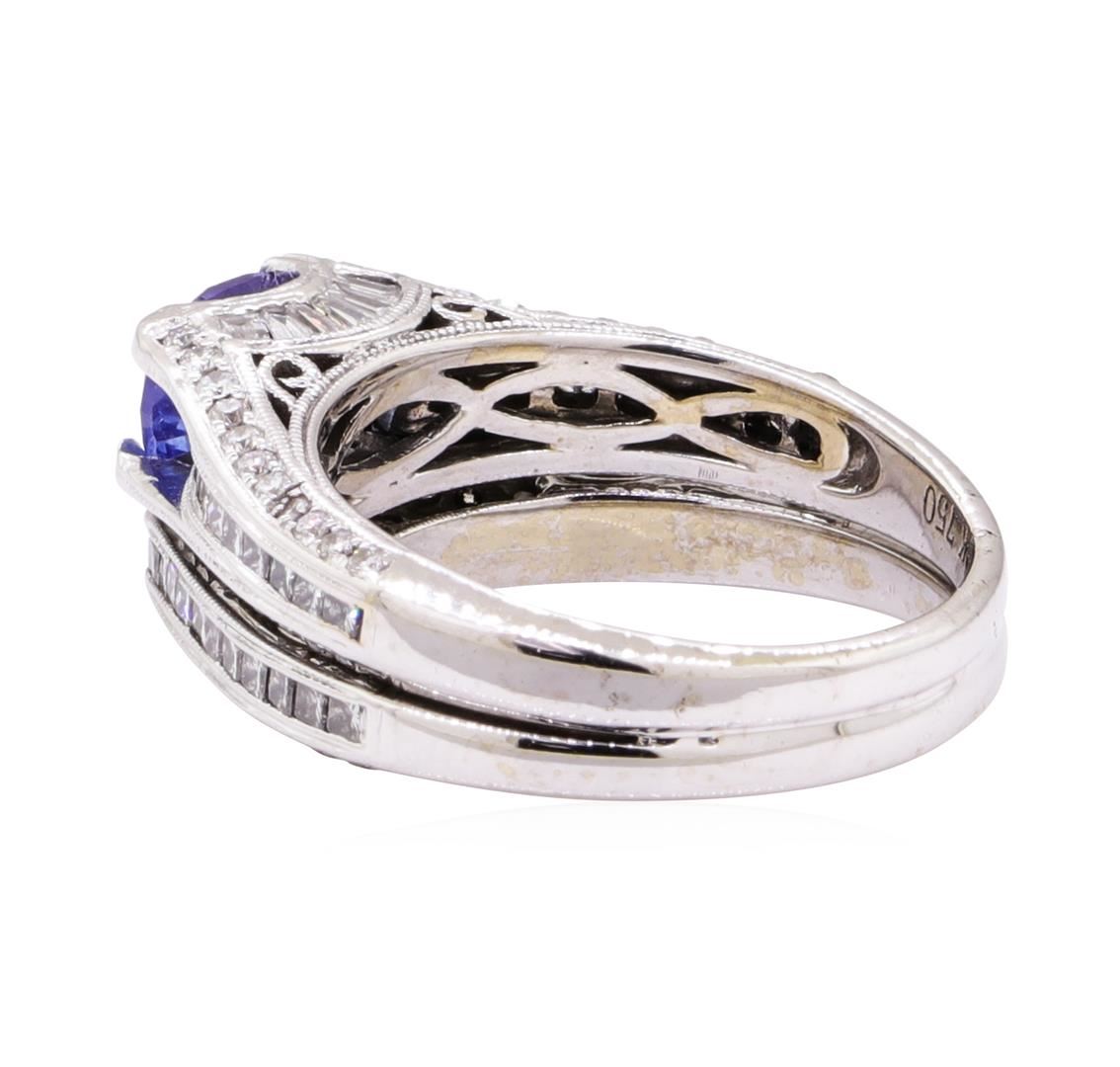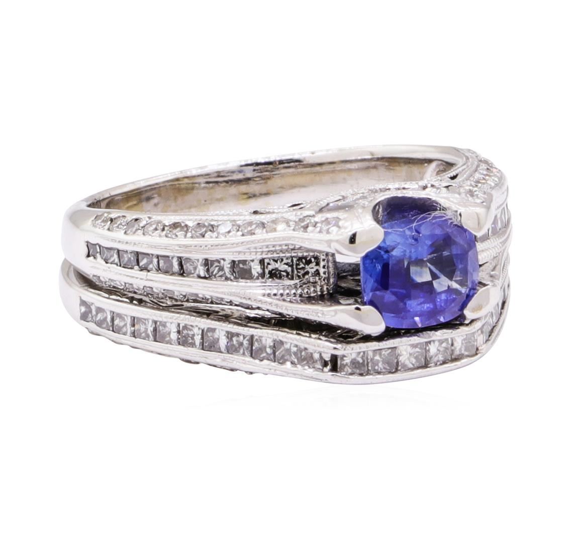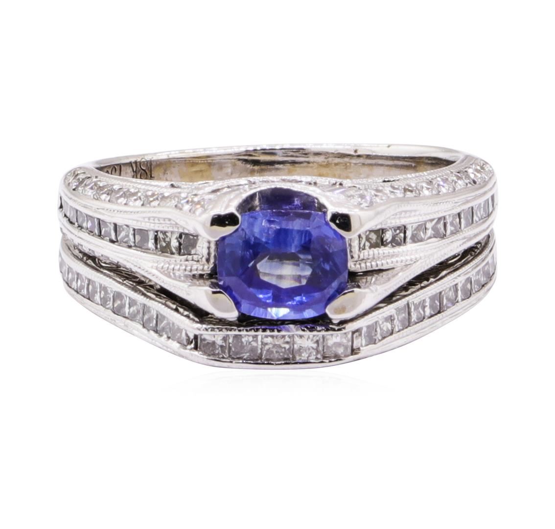 One electronically tested 18KT white gold lady's combination cast & assembled vintage style fashion ring and attached band with a cathedral shank with a bright polish with milgrain detailing finish. The featured lady's ring set has a double shank measurin