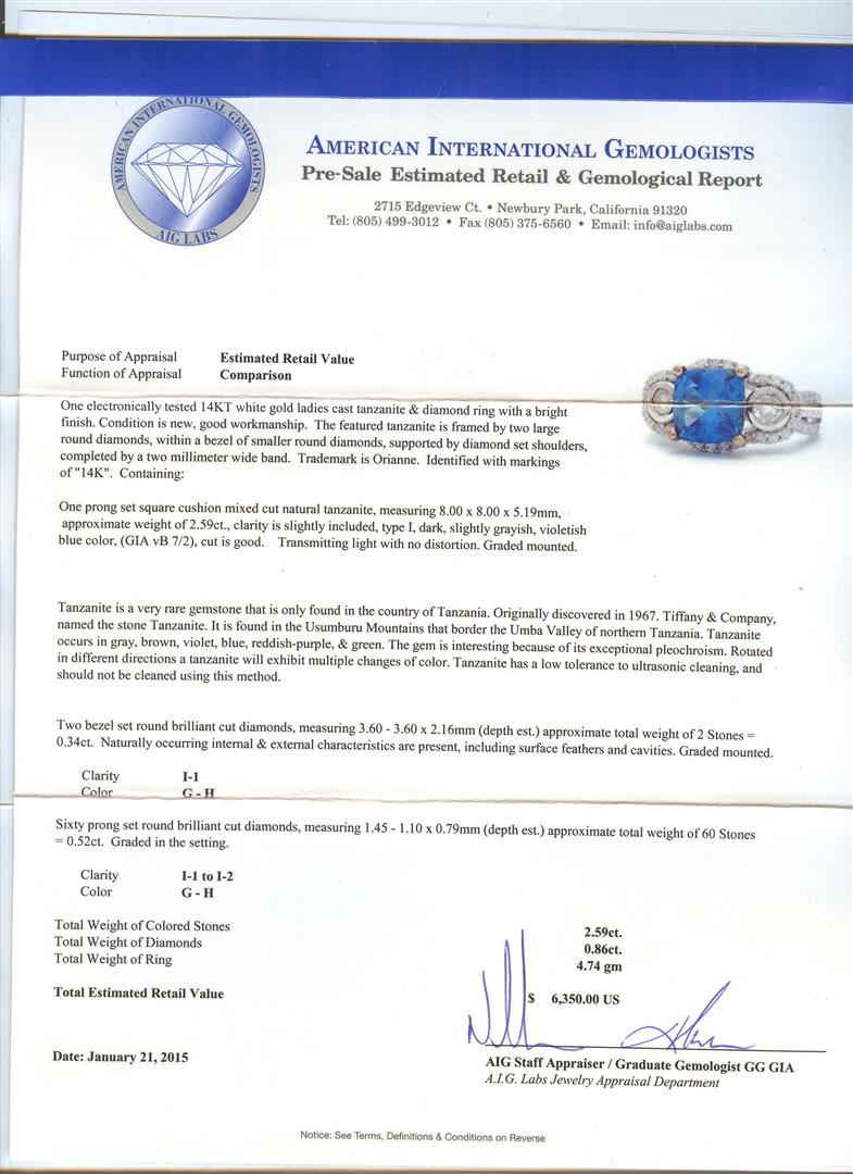 One electronically tested 14KT white gold ladies cast tanzanite & diamond ring with a bright finish. The featured tanzanite is framed by two large round diamonds, within a bezel of smaller round diamonds, supported by diamond set shoulders, completed by a two millimeter wide band. Trademark is Orianne. Identified with markings of "14K". Condition is new, good workmanship. Containing: One prong set square cushion mixed cut natural tanzanite, measuring 8.00 x 8.00 x 5.19mm, approximate weight of 2.59ct., clarity is slightly included, type I, dark, slightly grayish, violetish blue color, (GIA vB 7/2), cut is good. Transmitting light with no distortion. Graded mounted. Tanzanite is a very rare gemstone that is only found in the country of Tanzania. Originally discovered in 1967. Tiffany & Company, named the stone Tanzanite. It is found in the Usumburu Mountains that border the Umba Valley of northern Tanzania. Tanzanite occurs in gray, brown, violet, blue, reddish-purple, & green. The gem is interesting because of its exceptional pleochroism. Rotated in different directions a tanzanite will exhibit multiple changes of color. Tanzanite has a low tolerance to ultrasonic cleaning, and should not be cleaned using this method. Two bezel set round brilliant cut diamonds, measuring 3.60 - 3.60 x 2.16mm (depth est.) approximate total weight of 2 Stones = 0.34ct. Naturally occurring internal & external characteristics are present, including surface feathers and cavities. Graded mounted. Clarity: I-1. Color: G - H Sixty prong set round brilliant cut diamonds, measuring 1.45 - 1.10 x 0.79mm (depth est.) approximate total weight of 60 Stones = 0.52ct. Graded in the setting. Clarity: I-1 to I-2. Color: G - H. Total Weight of Colored Stones 2.59ct. Total Weight of Diamonds 0.86ct. AIG Appraised at $6,350.00.