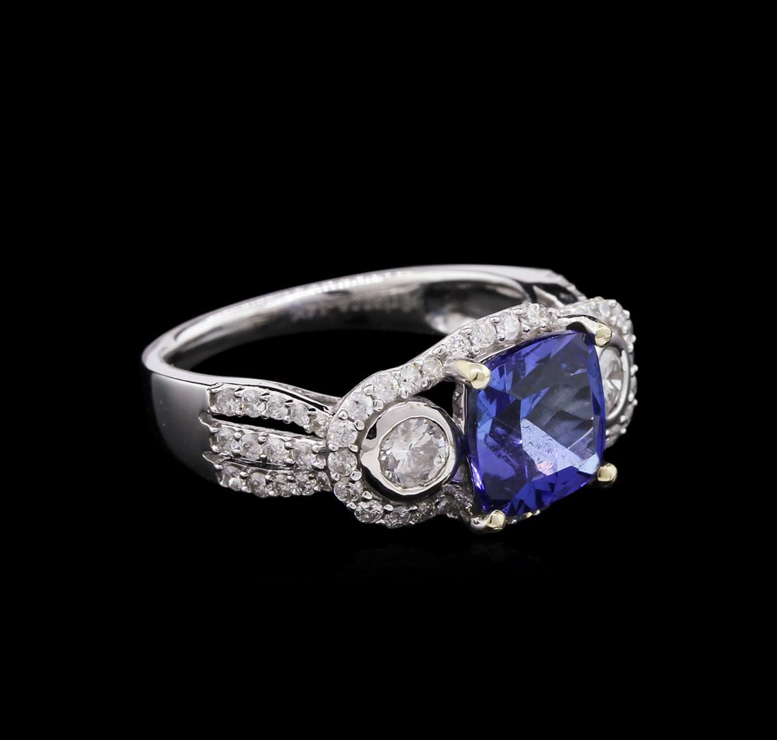 One electronically tested 14KT white gold ladies cast tanzanite & diamond ring with a bright finish. The featured tanzanite is framed by two large round diamonds, within a bezel of smaller round diamonds, supported by diamond set shoulders, completed by a two millimeter wide band. Trademark is Orianne. Identified with markings of "14K". Condition is new, good workmanship. Containing: One prong set square cushion mixed cut natural tanzanite, measuring 8.00 x 8.00 x 5.19mm, approximate weight of 2.59ct., clarity is slightly included, type I, dark, slightly grayish, violetish blue color, (GIA vB 7/2), cut is good. Transmitting light with no distortion. Graded mounted. Tanzanite is a very rare gemstone that is only found in the country of Tanzania. Originally discovered in 1967. Tiffany & Company, named the stone Tanzanite. It is found in the Usumburu Mountains that border the Umba Valley of northern Tanzania. Tanzanite occurs in gray, brown, violet, blue, reddish-purple, & green. The gem is interesting because of its exceptional pleochroism. Rotated in different directions a tanzanite will exhibit multiple changes of color. Tanzanite has a low tolerance to ultrasonic cleaning, and should not be cleaned using this method. Two bezel set round brilliant cut diamonds, measuring 3.60 - 3.60 x 2.16mm (depth est.) approximate total weight of 2 Stones = 0.34ct. Naturally occurring internal & external characteristics are present, including surface feathers and cavities. Graded mounted. Clarity: I-1. Color: G - H Sixty prong set round brilliant cut diamonds, measuring 1.45 - 1.10 x 0.79mm (depth est.) approximate total weight of 60 Stones = 0.52ct. Graded in the setting. Clarity: I-1 to I-2. Color: G - H. Total Weight of Colored Stones 2.59ct. Total Weight of Diamonds 0.86ct. AIG Appraised at $6,350.00.