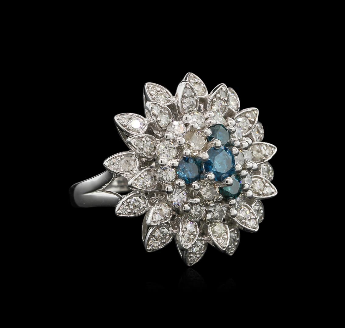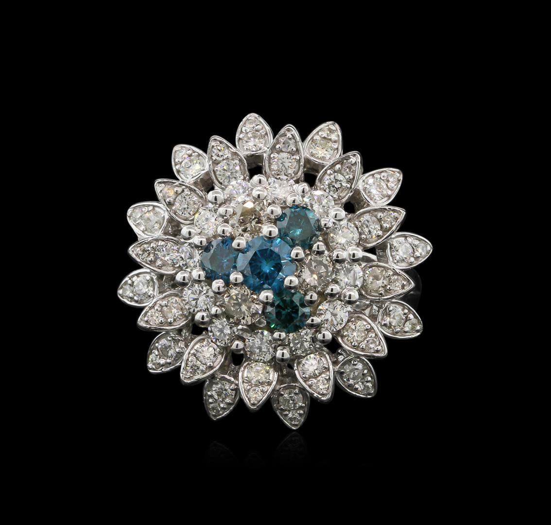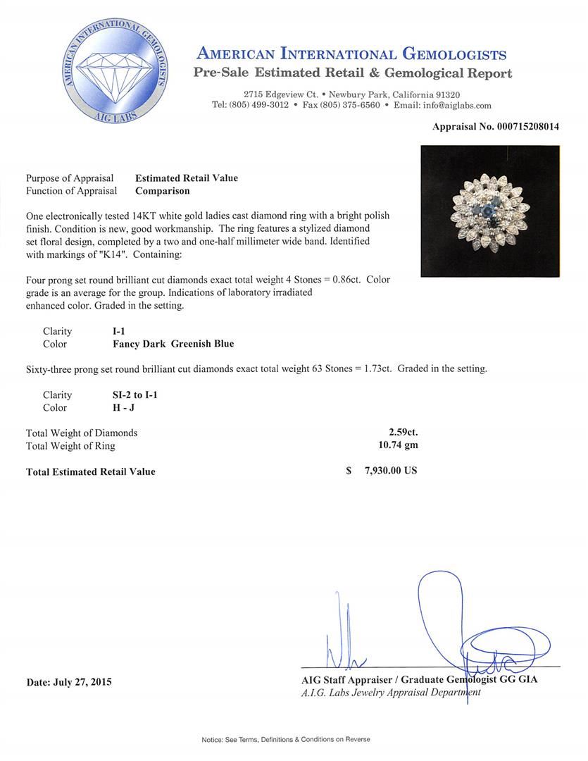 One electronically tested 14KT white gold ladies cast diamond ring with a bright polish finish. The ring features a stylized diamond set floral design, completed by a two and one-half millimeter wide band. Identified with markings of "K14". Condition is new, good workmanship. Containing: Four prong set round brilliant cut diamonds exact total weight 4 Stones = 0.86ct. Color grade is an average for the group. Indications of laboratory irradiated enhanced color. Graded in the setting. Clarity: I-1 Sixty-Three prong set round brilliant cut diamonds exact total weight 63 Stones = 1.73ct. Graded in the setting. Clarity: SI-2 to I-1. Color: H - J. Total Weight of Diamonds 2.59ct. Total Weight of Ring 10.74gm. AIG Appraised at $7,930.00.