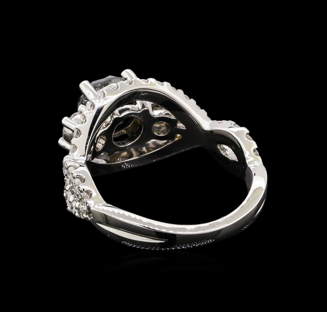 One electronically tested 14KT white gold lady's cast fashion ring with a split crossover shank with a bright polish finish. The featured lady's ring has a shank measuring 2.24 millimeters wide. Identified with markings of '14K'. Condition is new, good workmanship. Containing: One prong set round brilliant cut diamond, measuring 6.90 - 6.85 x 4.71mm (depth est.) , 5.00.%. GTCF approximate weight of 1.60ct. Colored gemstones are presumed to have been subjected to commonly used enhancement processes. Graded in the setting. Cut Good Two prong set round brilliant cut diamonds, measuring 3.50 - 3.40 x 2.14mm (depth est.) approximate total weight of 2 Stones = 0.32ct. Graded in the setting. Clarity SI-1 to SI-2. Color: H - I Cut Good Forty-Six prong set round brilliant cut diamonds, measuring 1.60 - 1.55 x 0.98mm (depth est.) approximate total weight of 46 Stones = 0.68ct. Graded in the setting. Clarity SI-1 to I-1. Color: G - I Cut Good. Total Weight of Diamonds 2.60ct.. Total Weight of Ring 5.70gm. GAS Appraised at $5,050.00.
