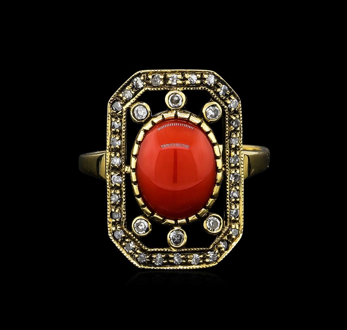 One ring featuring: 18KT yellow gold weighing 3.22 grams containing coral with a total weight of 2.60ct and diamonds with a total weight of 0.23ct.
