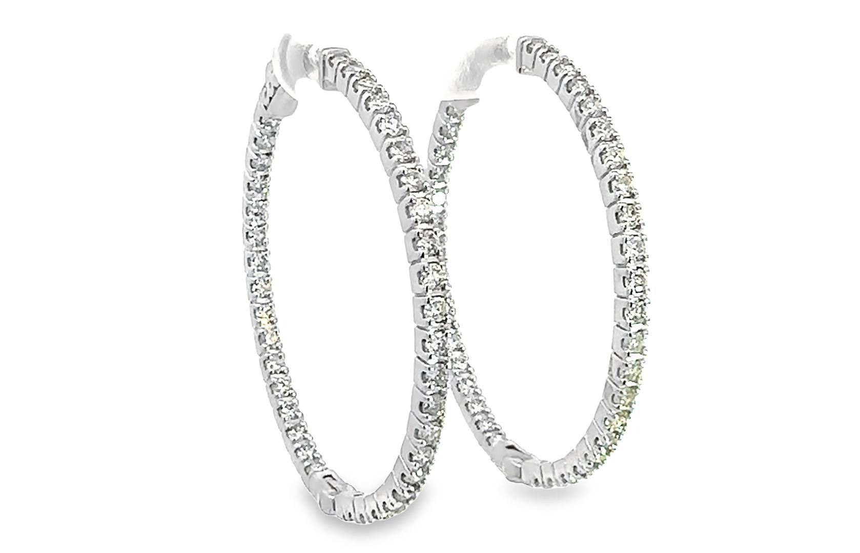 One pair electronically tested 14KT white gold lady's combination cast & assembled fashion inside-out hoop earrings with a bright polish finish. The featured hoop earring has a diameter of 38 millimeter. Identified with markings of "14K". Condition is new, good workmanship. Containing: Seventy-Six prong set round brilliant cut diamonds, measuring 2.10 - 2.00 x 1.32mm (depth est.) approximate total weight of 76 Stones = 2.60ct. Graded in the setting. Color I - J Clarity VS-2 to SI-1 Cut Very Good Total Weight of Diamonds 2.60ct. Total Weight of Earrings 9.40gm Estimated Retail Value $ 7750.00