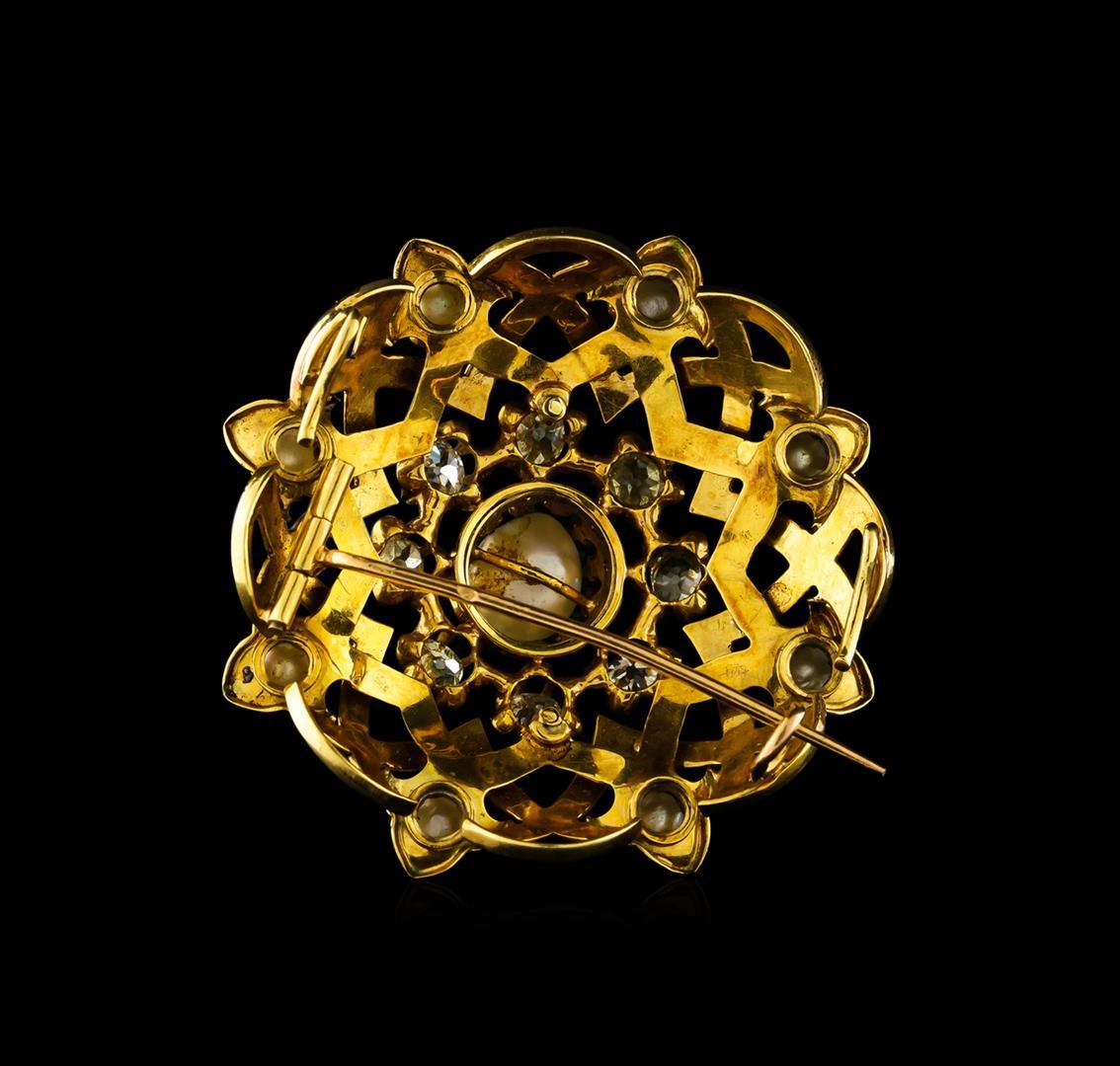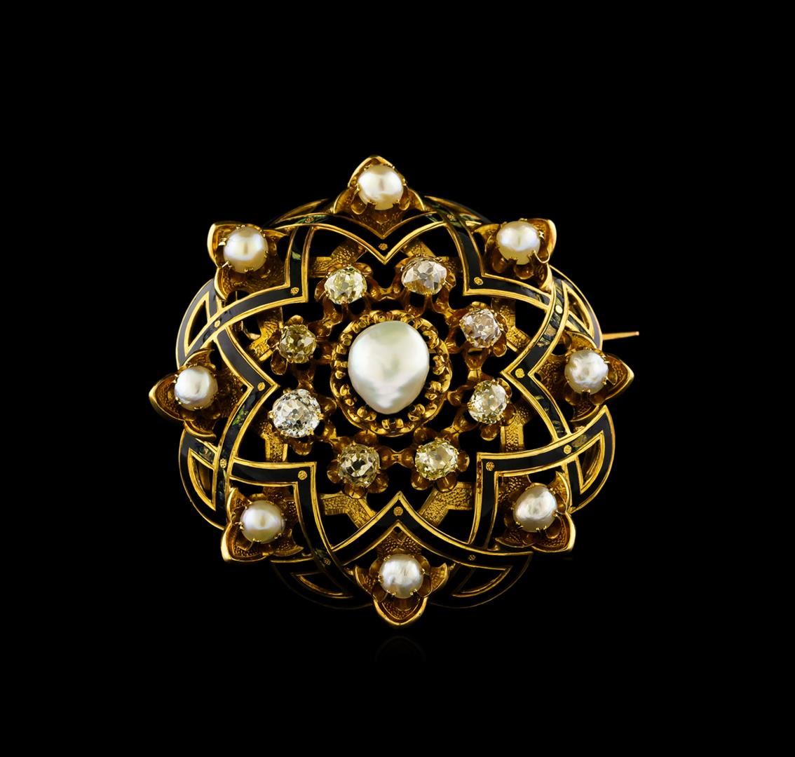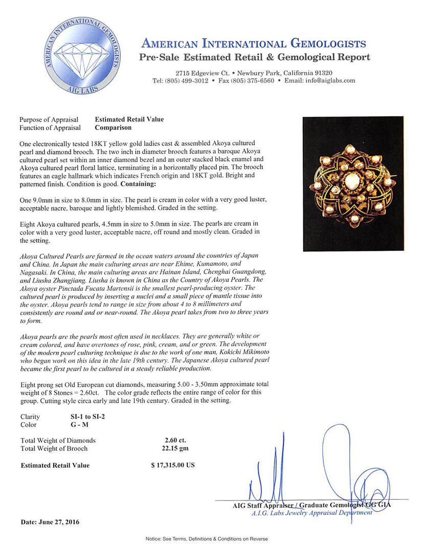 One electronically tested 18KT yellow gold ladies cast & assembled akoya cultured pearl and diamond brooch. The two inch in diameter brooch features a baroque akoya cultured pearl set within an inner diamond bezel and an outer stacked black enamel and akoya cultured pearl floral lattice, terminating in a horizontally placed pin. The brooch features an eagle hallmark which indicates French origin and 18KT gold. Bright and patterned finish. Condition is good. Containing: One 9.0mm in size to 8.0mm in size. The pearl is cream in color with a very good luster, acceptable nacre, baroque, lightly blemished Graded in the setting. Eight akoya cultured pearls, 4.5mm in size to 5.0mm in size. The pearls are cream in color with a very good luster, acceptable nacre, off round, mostly clean Graded in the setting. Akoya Cultured Pearls are farmed in the ocean waters around the countries of Japan and China. In Japan the main culturing areas are near Ehime, Kumamoto, and Nagasaki. In China, the main culturing areas are Hainan Island, Chenghai Guangdong, and Liusha Zhangjiang. Liusha is known in China as the Country of Akoya Pearls. The Akoya oyster Pinctada Fucata Martensii is the smallest pearl-producing oyster. The cultured pearl is produced by inserting a nuclei and a small piece of mantle tissue into the oyster. Akoya pearls tend to range in size from about 4 to 8 millimeters and consistently are round and or near-round. The Akoya pearl takes from two to three years to form. Akoya pearls are the pearls most often used in necklaces. They are generally white or cream colored, and have overtones of rose, pink, cream, and or green. The development of the modern pearl culturing technique is due to the work of one man, Kokichi Mikimoto who began work on this idea in the late 19th century. The Japanese Akoya cultured pearl became the first pearl to be cultured in a steady reliable production. One prong set Old European cut diamond, measuring 5.00 - 4.80 x 3.48mm (depth est.) approximate weight of 0.52ct. Clarity: SI-1. Color: G Six prong set Old European cut diamonds, measuring 4.30 - 4.00 x 3.00mm (depth est.) approximate total weight of 6 Stones = 1.90ct. The color grade reflects the entire range of color for this group. Cutting style circa early and late 19th century. Graded in the setting. Clarity: SI-1 to SI-2. Color: I - M One prong set Old European cut diamond, measuring 3.70 - 3.50 x 2.23mm (depth est.) approximate weight of 0.18ct. Graded in the setting. Clarity: SI-1. Color: M. Total Weight of Diamonds 2.60ct. Total Weight of Brooch 22.15gm. AIG Appraised at $17,315.00.