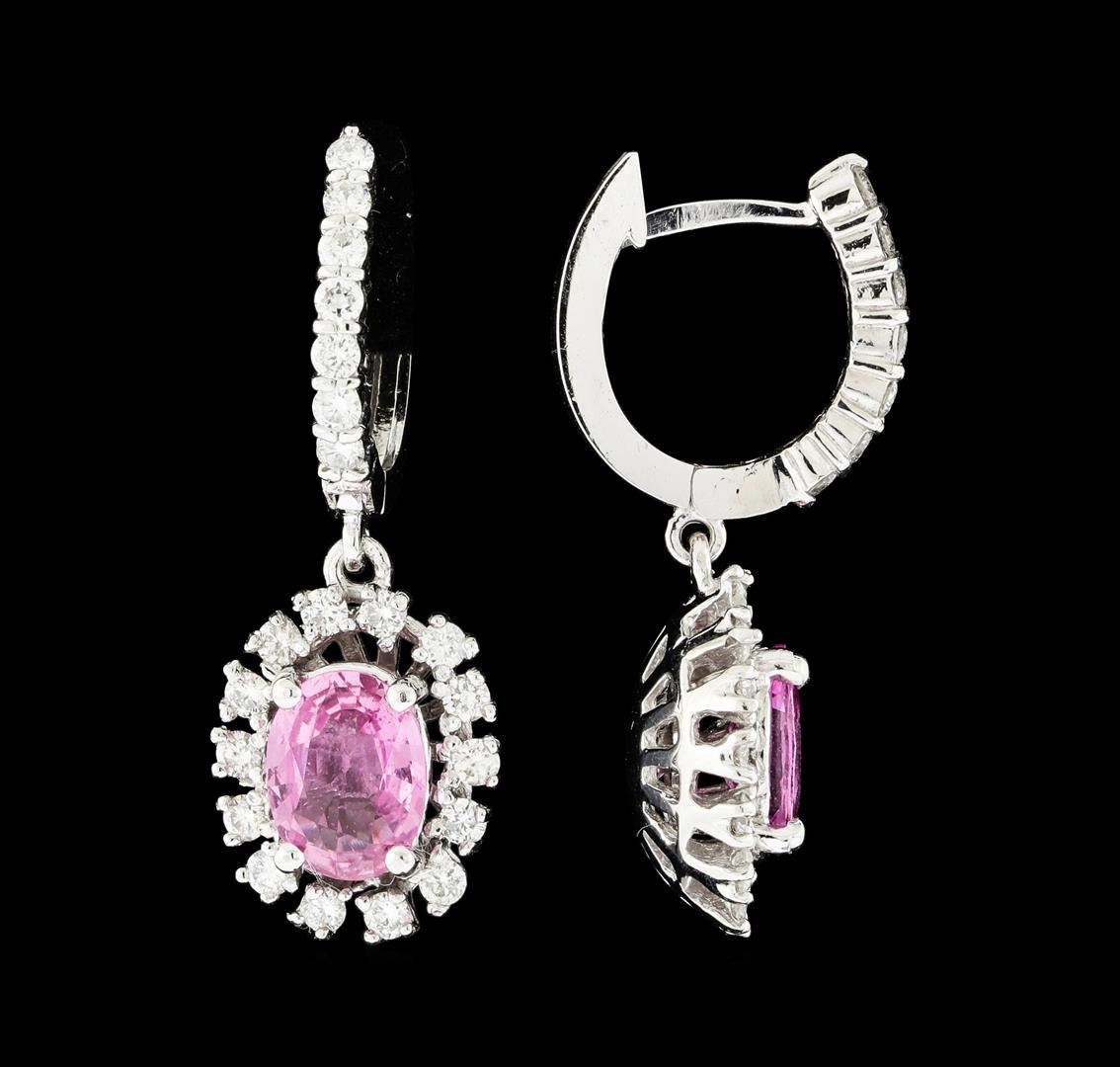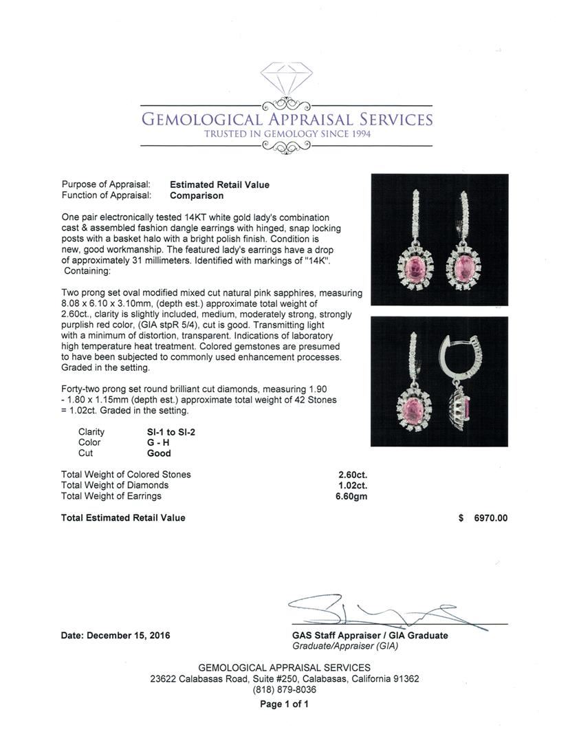 One pair electronically tested 14KT white gold lady's combination cast & assembled fashion dangle earrings with hinged, snap locking posts with a basket halo with a bright polish finish. The featured lady's earrings have a drop of approximately 31 millimeters. Identified with markings of '14K'. Condition is new, good workmanship. Containing: Two prong set oval modified mixed cut natural pink sapphires, measuring 8.08 x 6.10 x 3.10mm, (depth est.) approximate total weight of 2.60ct., clarity is slightly included, medium, moderately strong, strongly purplish red color, (GIA stpR 5/4), cut is good. Transmitting light with a minimum of distortion, transparent. Indications of laboratory high temperature heat treatment. Colored gemstones are presumed to have been subjected to commonly used enhancement processes. Graded in the setting. Forty-Two prong set round brilliant cut diamonds, measuring 1.90 - 1.80 x 1.15mm (depth est.) approximate total weight of 42 Stones = 1.02ct. Graded in the setting. Clarity SI-1 to SI-2. Color: G - H Cut Good. Total Weight of Colored Stones 2.60ct.. Total Weight of Diamonds 1.02ct.. Total Weight of Earrings 6.60gm. GAS Appraised at $6,970.00.