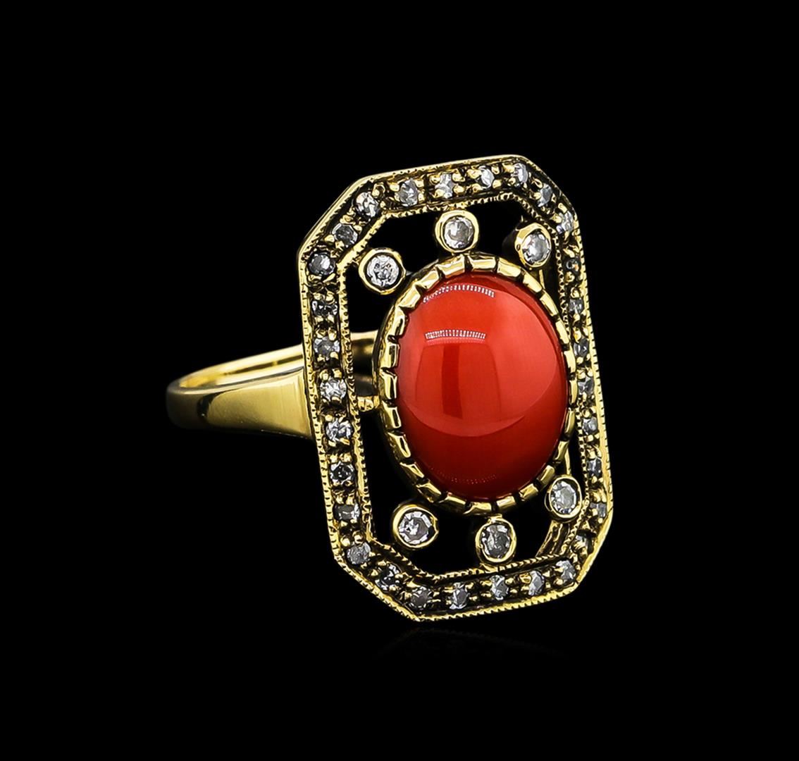 One ring featuring: 18KT yellow gold weighing 3.22 grams containing coral with a total weight of 2.60ct and diamonds with a total weight of 0.23ct.