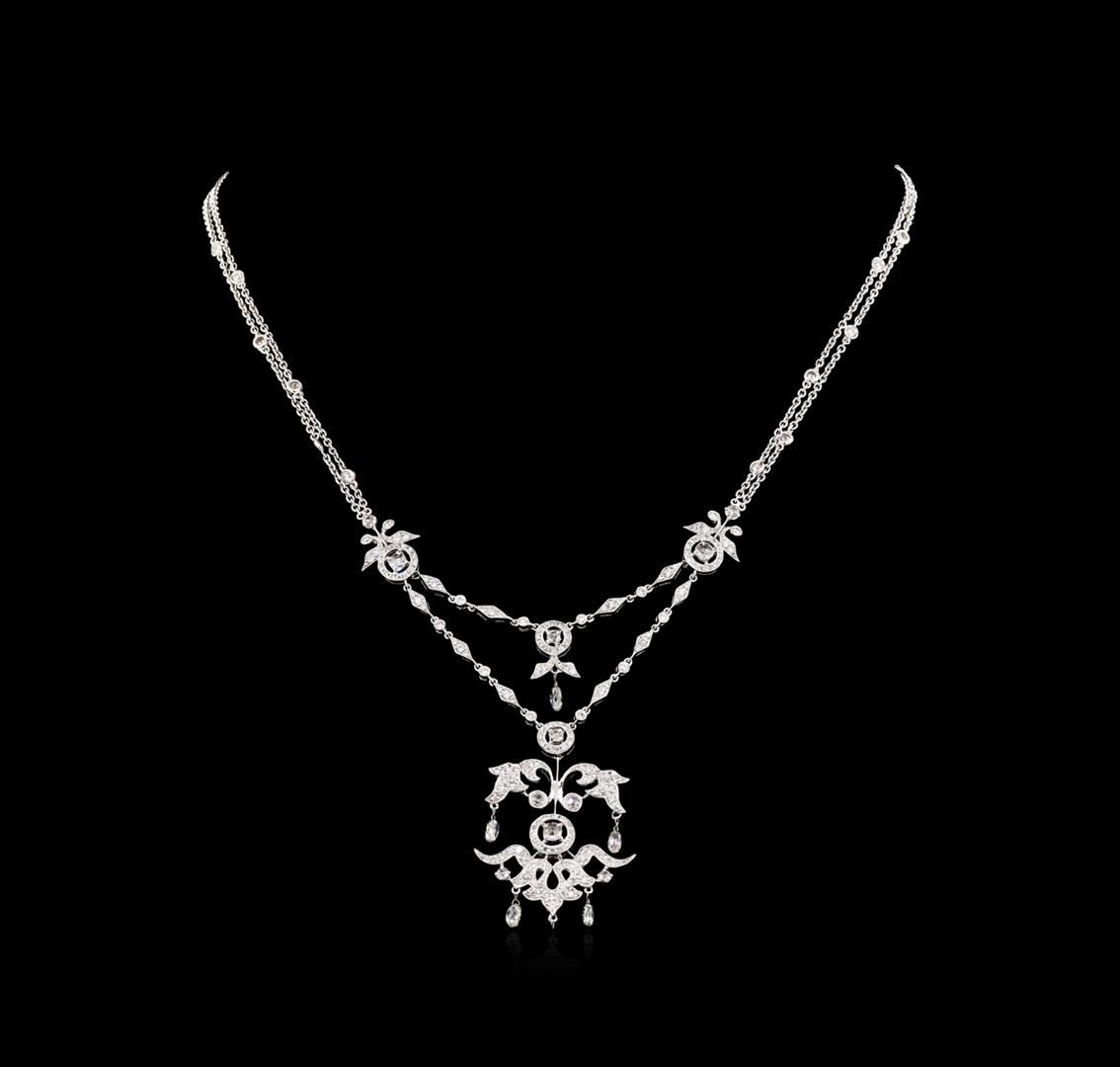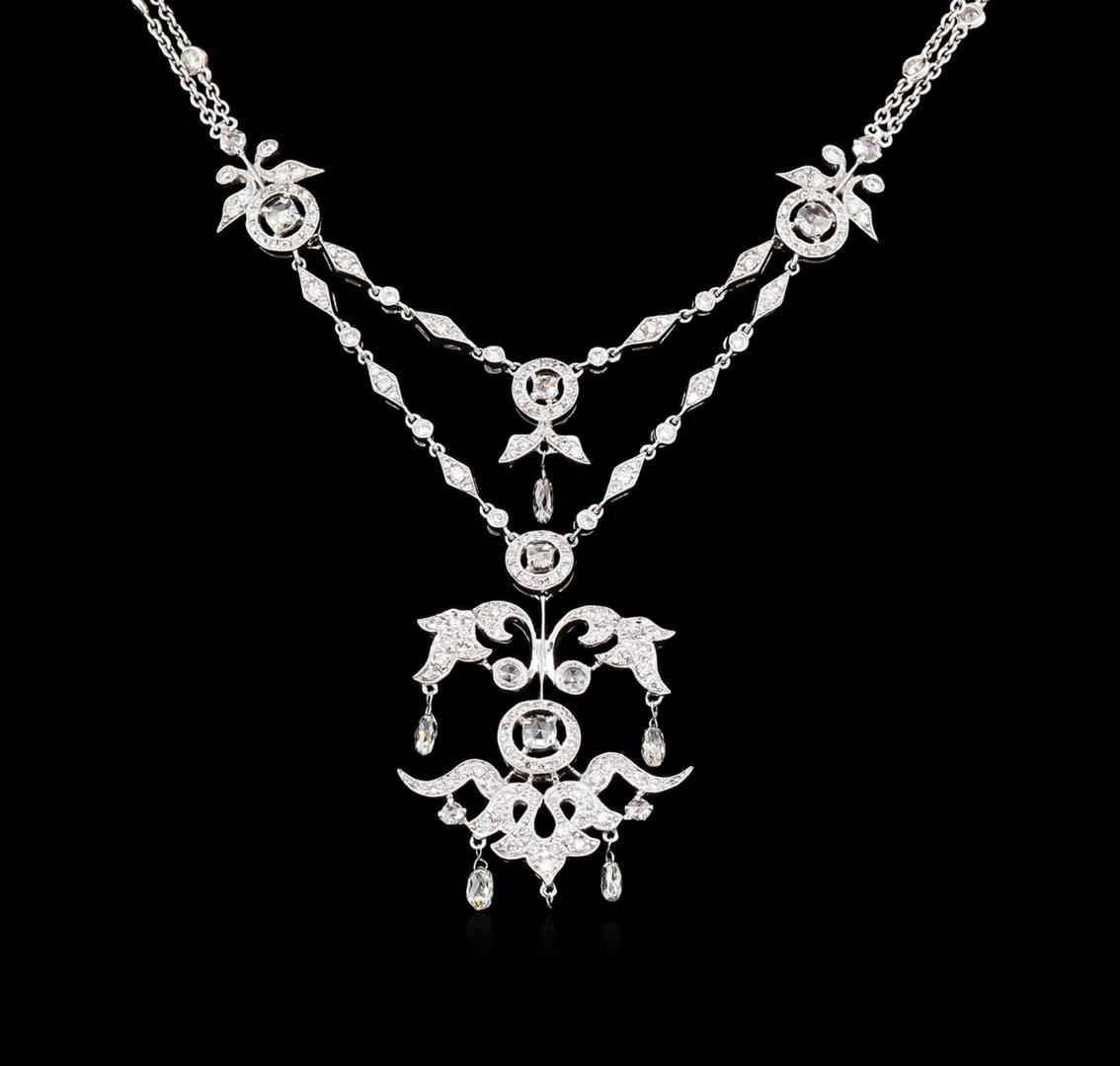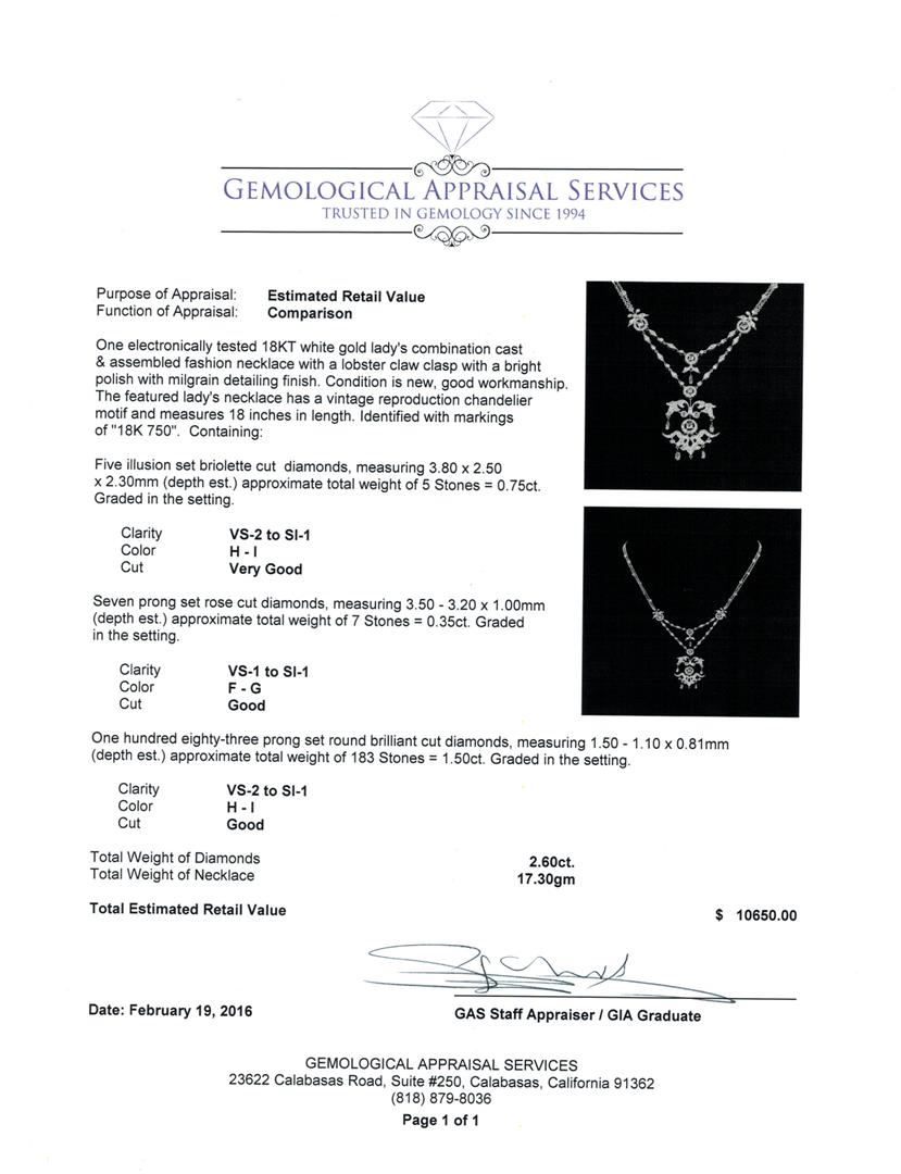 One electronically tested 18KT white gold lady's combination cast & assembled fashion necklace with a lobster claw clasp with a bright polish with milgrain detailing finish. The featured lady's necklace has a vintage reproduction chandelier motif and measures 18 inches in length. Identified with markings of "18K 750". Condition is new, good workmanship. Containing: Five illusion set briolette cut diamonds, measuring 3.80 x 2.50 x 2.30mm (depth est.) approximate total weight of 5 Stones = 0.75ct. Graded in the setting. Clarity: VS-2 to SI-1. Color: H - I. Cut Very Good Seven prong set rose cut diamonds, measuring 3.50 - 3.20 x 1.00mm (depth est.) approximate total weight of 7 Stones = 0.35ct. Graded in the setting. Clarity: VS-1 to SI-1. Color: F - Good One Hundred Eighty-Three prong set round brilliant cut diamonds, measuring 1.50 - 1.10 x 0.81mm (depth est.) approximate total weight of 183 Stones = 1.50ct. Graded in the setting. Clarity: VS-2 to SI-1. Color: H - I. Cut Good. Total Weight of Diamonds 2.60ct. Total Weight of Necklace 17.30gm. GAS Appraised at $10,650.00.