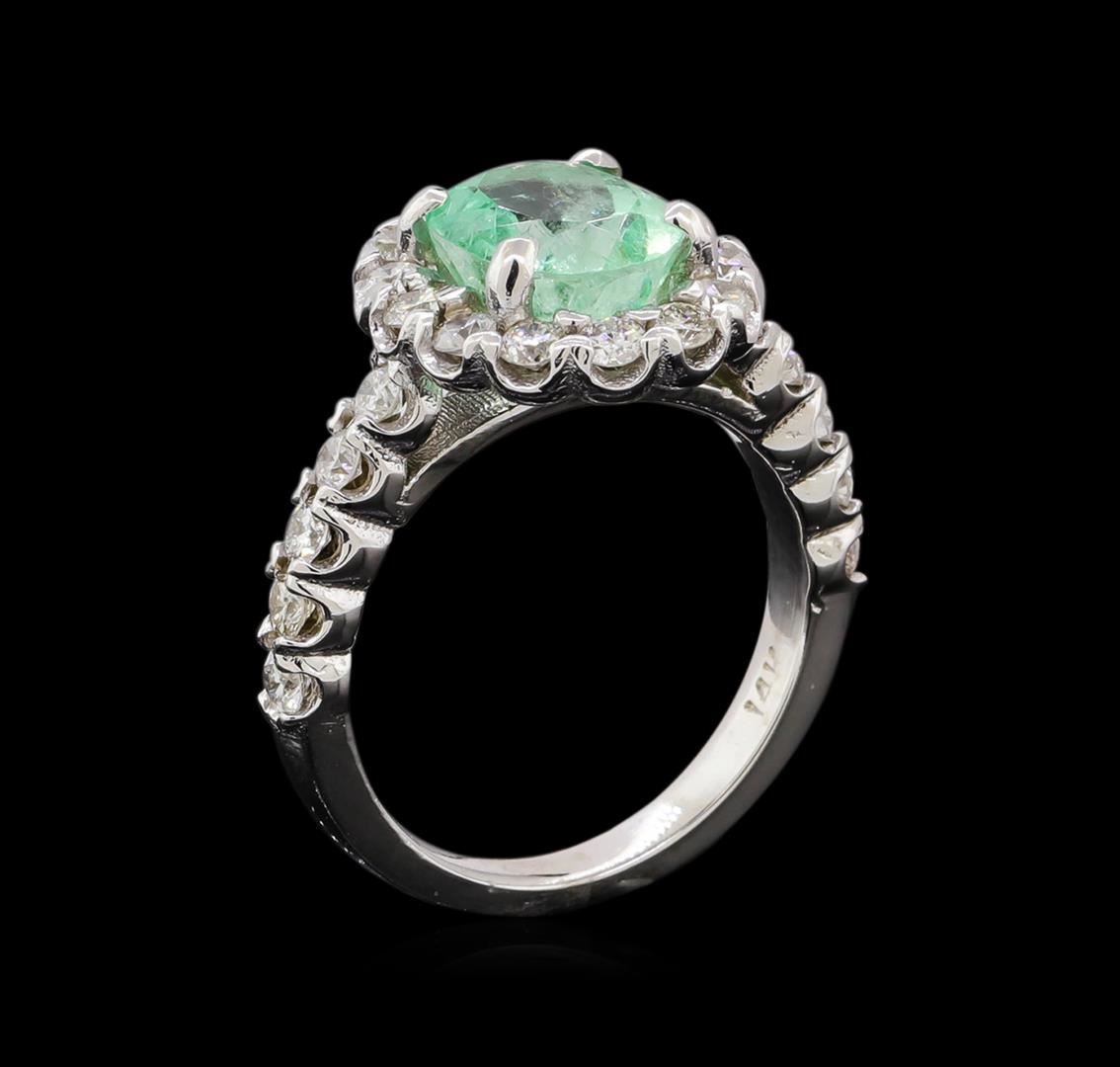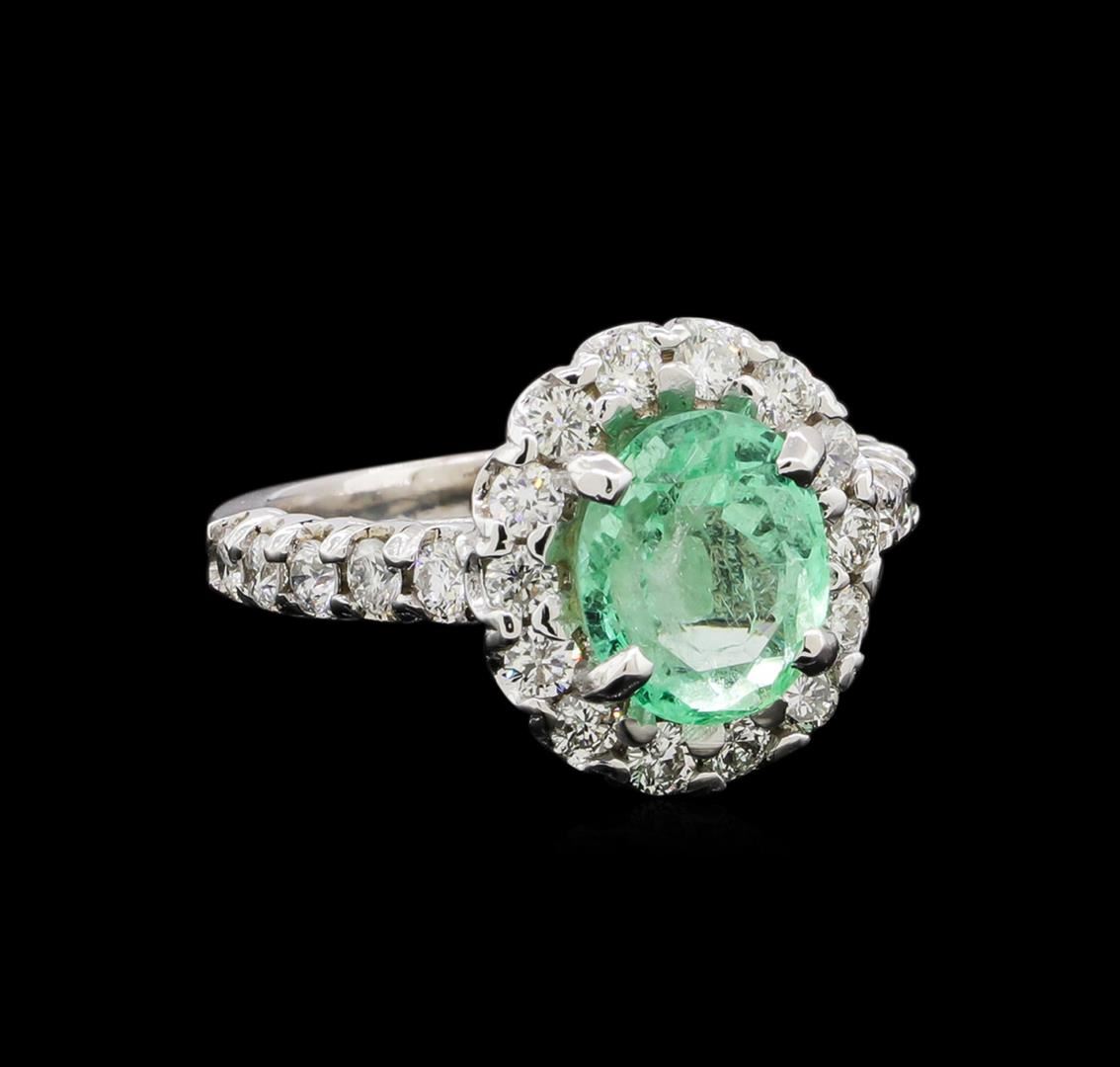 One electronically tested 14KT white gold lady's cast fashion ring with a basket halo with a bright polish finish. The featured lady's ring has a shank measuring 2.28 millimeters in width. Identified with markings of '14K'. Condition is new, good workmanship. Containing: One prong set oval modified brilliant cut natural emerald, measuring 9.45 x 7.80 x 6.30mm, (depth est.) approximate weight of 2.61ct., clarity is moderately included, medium light, moderately strong, green color, (GIA G 4/4), cut is good. Transmitting light somewhat diffusely, transparent to translucent. Indications of oil residue. Naturally occurring internal & external characteristics are present. Colored gemstones are presumed to have been subjected to commonly used enhancement processes. Graded in the setting. Twenty-Four prong set round brilliant cut diamonds, measuring 2.35 - 2.30 x 1.40mm (depth est.) approximate total weight of 24 Stones = 1.07ct. Graded in the setting. Clarity SI-1 to SI-2. Color: H - I Cut Good. Total Weight of Colored Stones 2.61ct.. Total Weight of Diamonds 1.07ct.. Total Weight of Ring 5.90gm. GAS Appraised at $5,380.00.