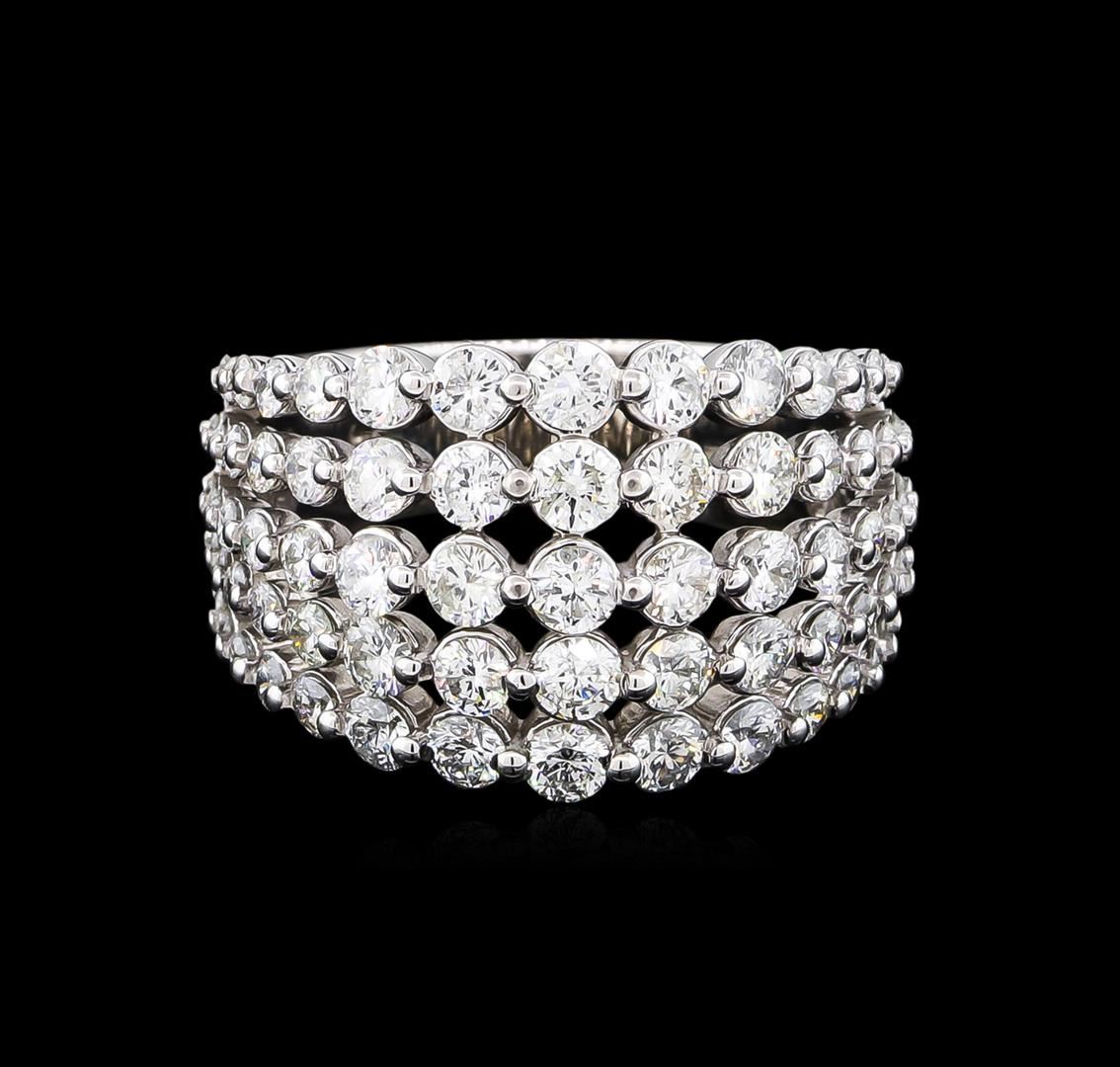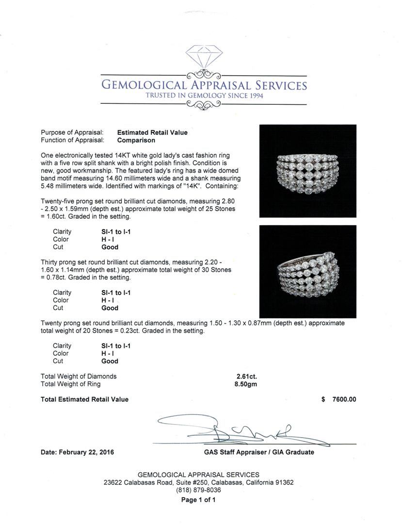 One electronically tested 14KT white gold lady's cast fashion ring with a five row split shank with a bright polish finish. The featured lady's ring has a wide domed band motif measuring 14.60 millimeters wide and a shank measuring 5.48 millimeters wide. Identified with markings of "14K". Condition is new, good workmanship. Containing: Twenty-Five prong set round brilliant cut diamonds, measuring 2.80 - 2.50 x 1.59mm (depth est.) approximate total weight of 25 Stones = 1.60ct. Graded in the setting. Clarity: SI-1 to I-1. Color: H - I. Cut Good Thirty prong set round brilliant cut diamonds, measuring 2.20 - 1.60 x 1.14mm (depth est.) approximate total weight of 30 Stones = 0.78ct. Graded in the setting. Clarity: SI-1 to I-1. Color: H - I. Cut Good Twenty prong set round brilliant cut diamonds, measuring 1.50 - 1.30 x 0.87mm (depth est.) approximate total weight of 20 Stones = 0.23ct. Graded in the setting. Clarity: SI-1 to I-1. Color: H - I. Cut Good. Total Weight of Diamonds 2.61ct. Total Weight of Ring 8.50gm. GAS Appraised at $7,600.00.