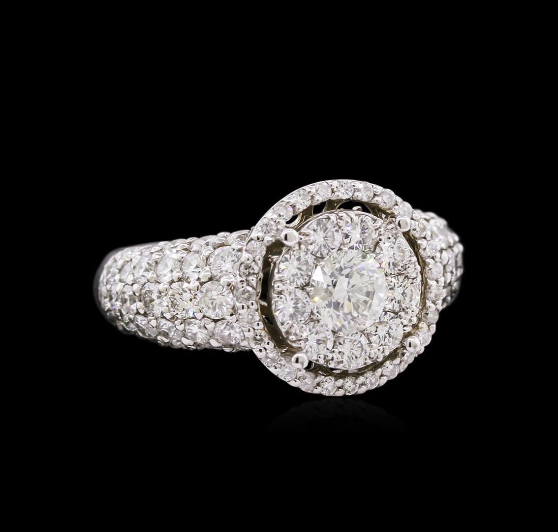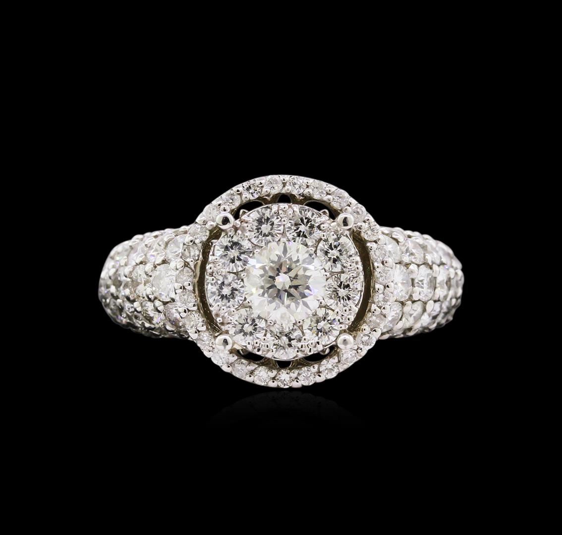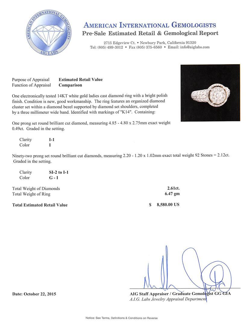 One electronically tested 14KT white gold ladies cast diamond ring with a bright polish finish. The ring features an organized diamond cluster set within a diamond bezel supported by diamond set shoulders, completed by a three millimeter wide band. Identified with markings of "K14". Condition is new, good workmanship. Containing: One prong set round brilliant cut diamond, measuring 4.85 - 4.80 x 2.75mm exact weight 0.49ct. Graded in the setting. Clarity: I-1. Color: I Ninety-Two prong set round brilliant cut diamonds, measuring 2.20 - 1.20 x 1.02mm exact total weight 92 Stones = 2.12ct. Graded in the setting. Clarity: SI-2 to I-1. Color: G - I. Total Weight of Diamonds 2.61ct. Total Weight of Ring 6.47gm. AIG Appraised at $8,580.00.