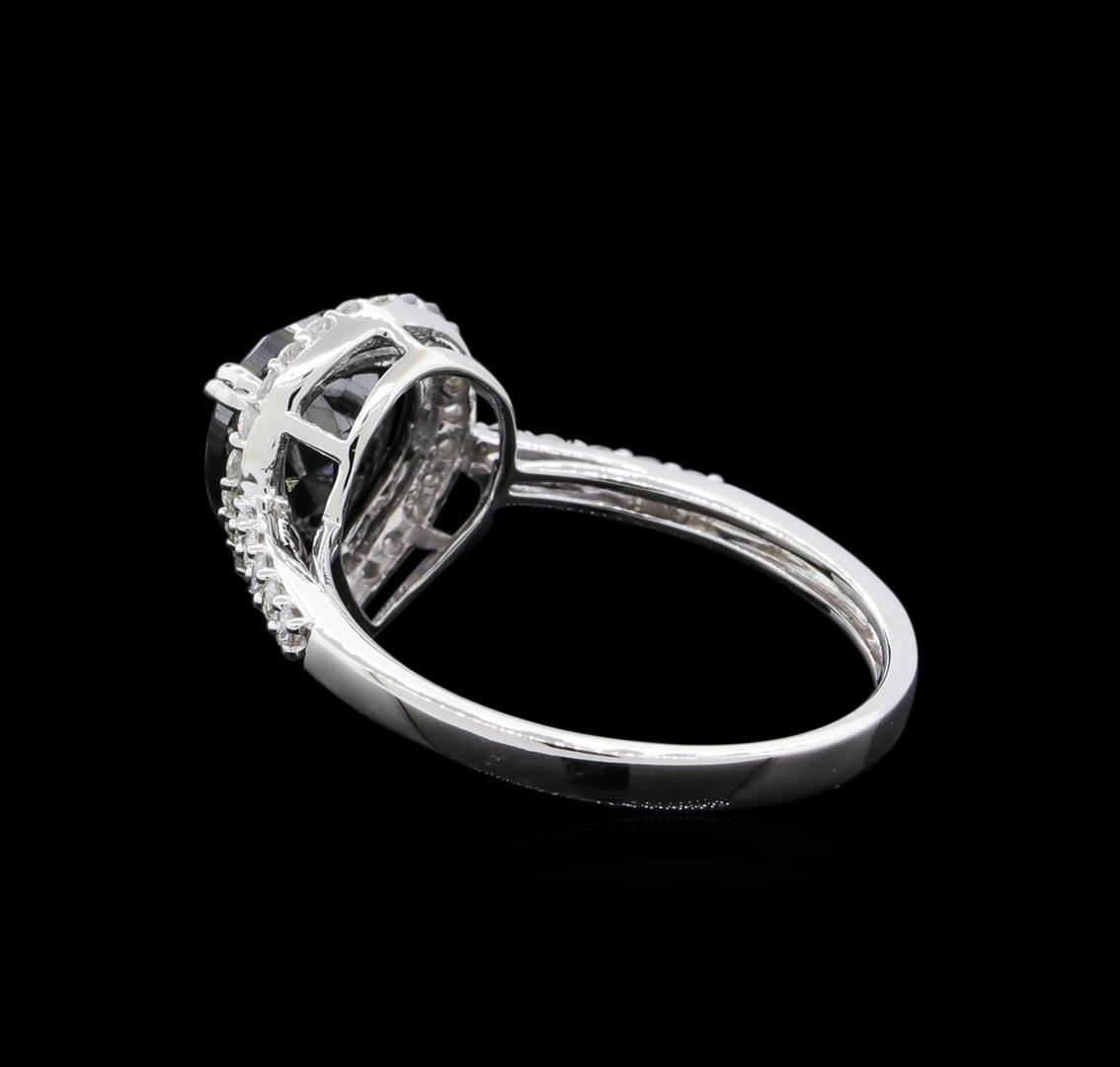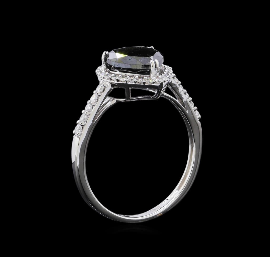 One electronically tested 14KT white gold ladies cast black and white diamond ring with a bright polish finish. The featured black diamond is set within a white diamond bezel supported by white diamond set shoulders, completed by a two millimeter wide band. Trademark is Orianne. Identified with markings of "14K". Condition is new, good workmanship. Containing: One prong set pear shaped cut diamond, measuring 9.20 x 7.90 x 3.90mm (depth est.) approximate weight of 2.33ct. Indications of multiple laboratory enhancements. Graded in the setting. Clarity Déclassé‚. Color: Fancy Black; Irradiated. Depth: 49.4%. Table: 73.4%. Thirty-Five prong set round brilliant cut diamonds, measuring 1.40 - 1.20 x 0.78mm (depth est.) approximate total weight of 35 Stones = 0.29ct. Graded in the setting. Clarity: SI-1 to I-1. Color: G - I. Total Weight of Diamonds 2.62ct. Total Weight of Ring 2.67gm. AIG Appraised at $3,115.00.
