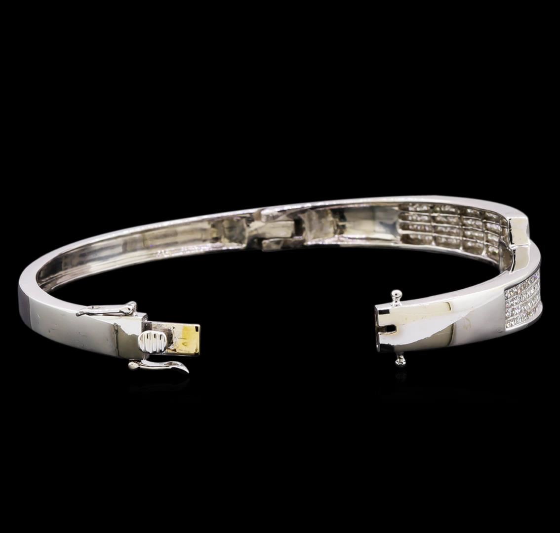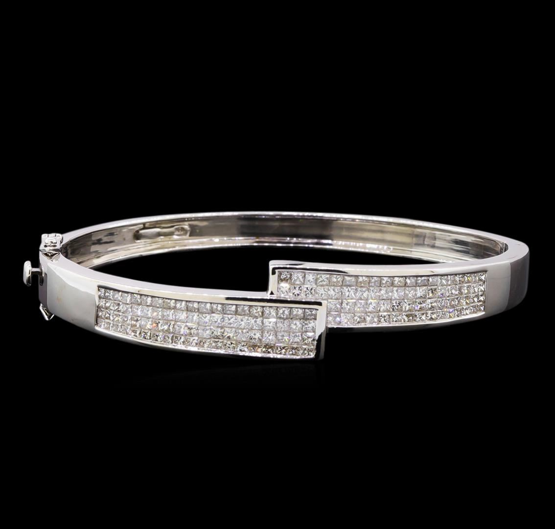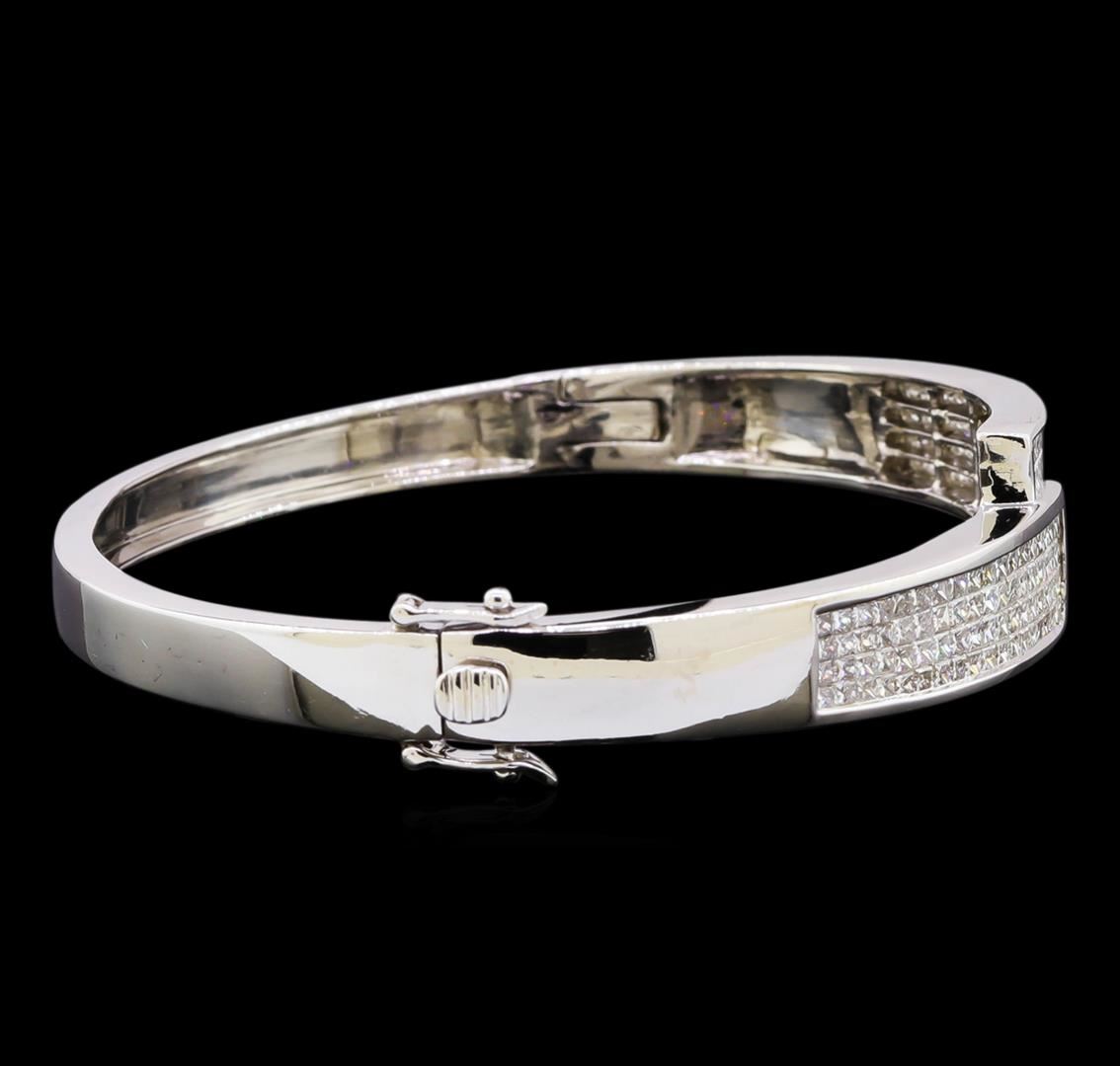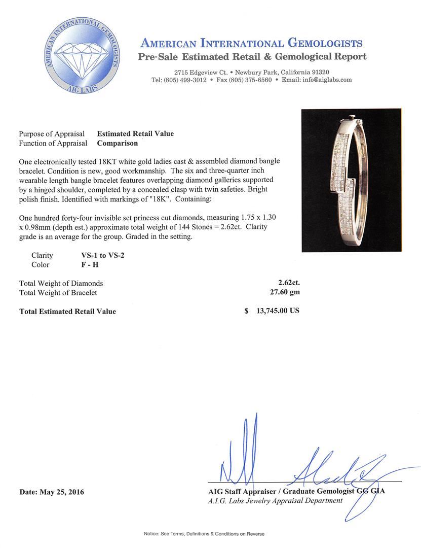 One electronically tested 18KT white gold ladies cast & assembled diamond bangle bracelet. The six and three-quarter inch wearable length bangle bracelet features overlapping diamond galleries supported by a hinged shoulder, completed by a concealed clasp with twin safeties. Bright polish finish. Identified with markings of "18K". Condition is new, good workmanship. Containing: One Hundred Forty-Four invisible set princess cut diamonds, measuring 1.75 x 1.30 x 0.98mm (depth est.) approximate total weight of 144 Stones = 2.62ct. Clarity grade is an average for the group. Graded in the setting. Clarity: VS-1 to VS-2. Color: F - H. Total Weight of Diamonds 2.62ct. Total Weight of Bracelet 27.60gm. AIG Appraised at $13,745.00.
