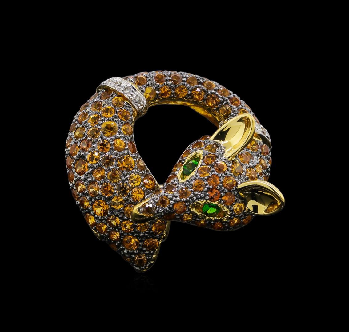 One electronically tested 18KT yellow gold ladies cast multi color gemstone and diamond ring. The ring features a fox motif. The head and the nose of the fox are encrusted with orange sapphires. Two tsavorite garnets accent the eyes. The orange sapphire set body of the fox is curved so that the tail is placed under the mouth. There are two diamond set bands place at the back of the fox's head and the beginning of the tail. The ring is completed by a two and one-half millimeter wide band. Bright and anodized finish with rhodium accents. Identified with markings of "750". Condition is good. Containing: One hundred twenty-one bead set round mixed cut natural orange sapphires, measuring 1.70 - 1.50 x 1.04 mm, approximate total weight of 2.52ct., clarity is eye clean, type II, medium, brownish, yellowish orange color, (GIA yO 5/3), cut is good. Transmitting light with no distortion, transparent. Color grade is an average for the group. Graded in the setting. Two channel set round brilliant cut natural tsavorite garnets, measuring 2.00 - 2.00 x 1.30 mm, approximate total weight of 0.10ct., clarity is eye clean, type II, medium dark, very slightly grayish, green color, (GIA G 6/3), cut is good. Transmitting light with no distortion, transparent. Color grade is an average for the pair. Graded in the setting. Fifteen bead set round brilliant cut diamonds, measuring 1.10 - 1.00 x 0.63mm (depth est.) approximate total weight of 15 Stones = 0.10ct. Graded in the setting. Clarity: SI-1 to SI-2. Color: F - G. Total Weight of Colored Stones 2.62ct. Total Weight of Diamonds 0.10ct. Total Weight of Ring 11.88gm. AIG Appraised at $5,390.00.