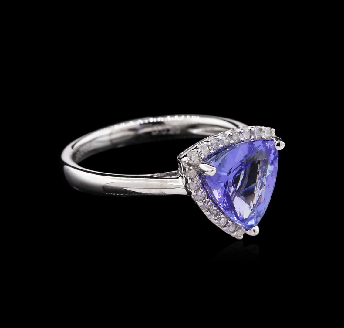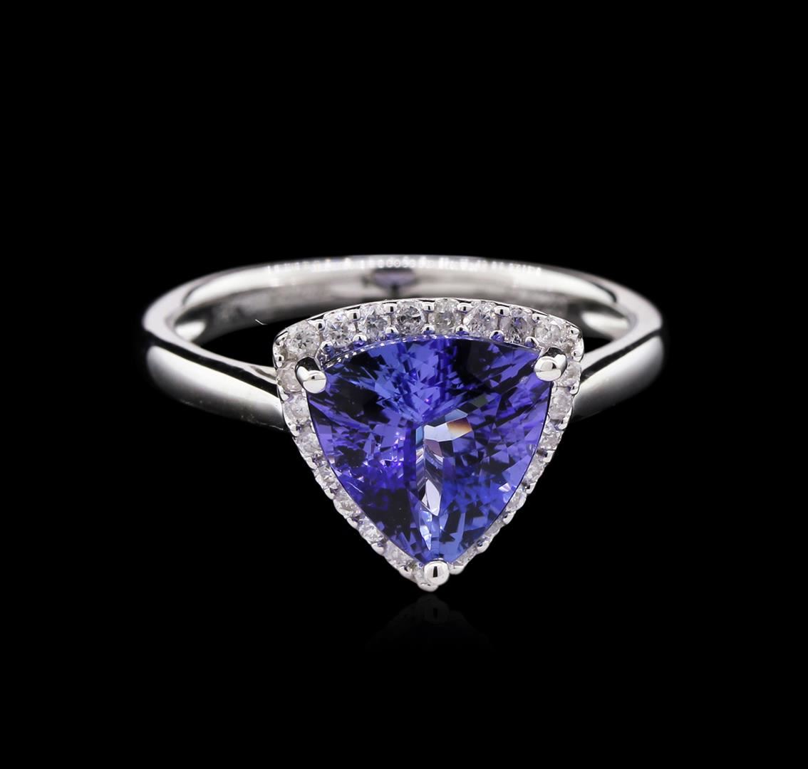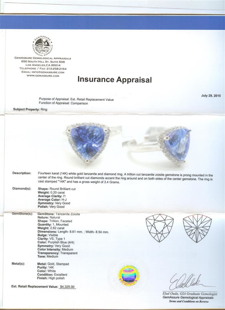 Fourteen karat (14K) white gold tanzanite and diamond ring. A trillion cut tanzanite zoisite gemstone is prong mounted in the center of the ring. Round brilliant cut diamonds accent the ring around and on both sides of the center gemstone. The ring is cast stamped "14K" and has a gross weight of 3.4 Grams. Diamond(s): Shape: Round Brilliant cut. Weight: 0.20 carat. Average Clarity: I1. Average Color: H-I. Symmetry: Very Good. Polish: Very Good. GemStone(s): GemStone: Tanzanite Zoisite. Nature: Natural. Shape: Trillion, Faceted. Quantity: 1, Mounted. Weight: 2.62 carat. Dimensions: Length- 8.61 mm. ; Width- 8.54 mm. Bulge: Visible. Clarity: VS, Type 1. Color: Purplish Blue (4/4). Symmetry: Very Good. Color Intensity: Medium. Transparency: Transparent. Tone: Medium. Metal(s): Metal: Gold, Stamped. Purity: 14K. Color: White. Condition: Excellent. Finish: High polish. GGA Appraised at $4,325.00.