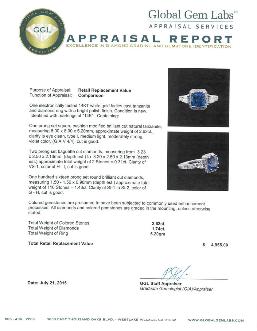 One electronically tested 14KT white gold ladies cast tanzanite and diamond ring with a bright polish finish. Identified with markings of "14K". Condition is new. Containing: One prong set square cushion modified brilliant cut natural tanzanite, measuring 8.00 x 8.00 x 5.20mm, approximate weight of 2.62ct., clarity is eye clean, type I, medium light, moderately strong, violet color, (GIA V 4/4), cut is good. Two prong set baguette cut diamonds, measuring from 3.23 x 2.50 x 2.13mm (depth est.) to 3.20 x 2.50 x 2.13mm (depth est.) approximate total weight of 2 Stones = 0.31ct. Clarity: VS-1. Color: H - I, Cut is Good. One Hundred Sixteen prong set round brilliant cut diamonds, measuring 1.50 - 1.50 x 0.90mm (depth est.) approximate total weight of 116 Stones = 1.43ct. Clarity: SI-1 to SI-2. Color: G - H, Cut is Good. Colored gemstones are presumed to have been subjected to commonly used enhancement processes. All diamonds and colored gemstones are graded in the mounting, unless otherwise stated. Total Weight of Colored Stones 2.62ct. Total Weight of Diamonds 1.74ct. Total Weight of Ring 5.20gm. GGL Appraised at $4,955.00.