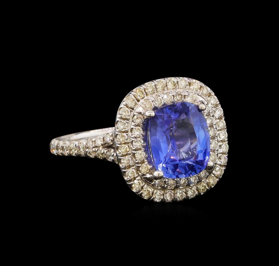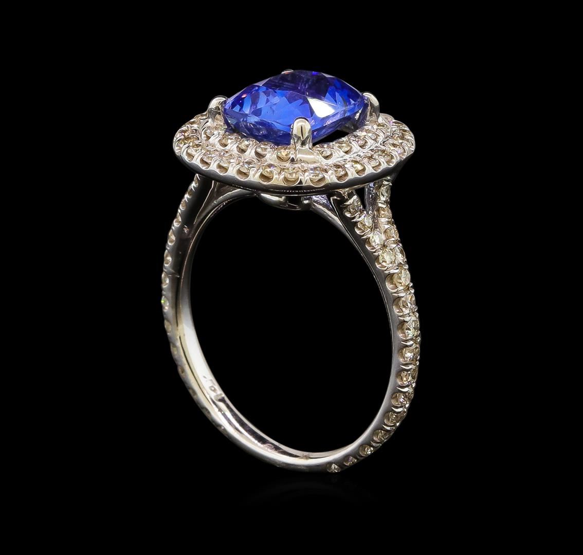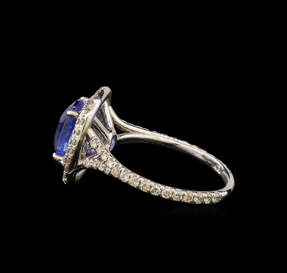 One electronically tested 14KT white gold lady's cast fashion ring with a split shank double basket halo with a bright polish finish. The featured lady's ring has a shank measuring 1.72 millimeters wide. Identified with markings of '14K'. Condition is new, good workmanship. Containing: One prong set rectangular cushion modified mixed cut natural blue sapphire, measuring 7.16 x 8.45 x 4.55mm, (depth est.) approximate weight of 2.63ct., clarity is slightly included, medium light, very slightly grayish, blue color, (GIA B 4/3), cut is good. Transmitting light with a minimum of distortion, transparent. Colored gemstones are presumed to have been subjected to commonly used enhancement processes. Graded loose prior to setting in the TGL Laboratory, Report #24010422. Eighty-Eight prong set round brilliant cut diamonds, measuring 1.40 - 1.30 x 0.81mm (depth est.) approximate total weight of 88 Stones = 0.79ct. Graded in the setting. Clarity SI-1 to SI-2. Color: H - I Cut Good. Total Weight of Colored Stones 2.63ct.. Total Weight of Diamonds 0.79ct.. Total Weight of Ring 4.10gm. GAS Appraised at $14,520.00.