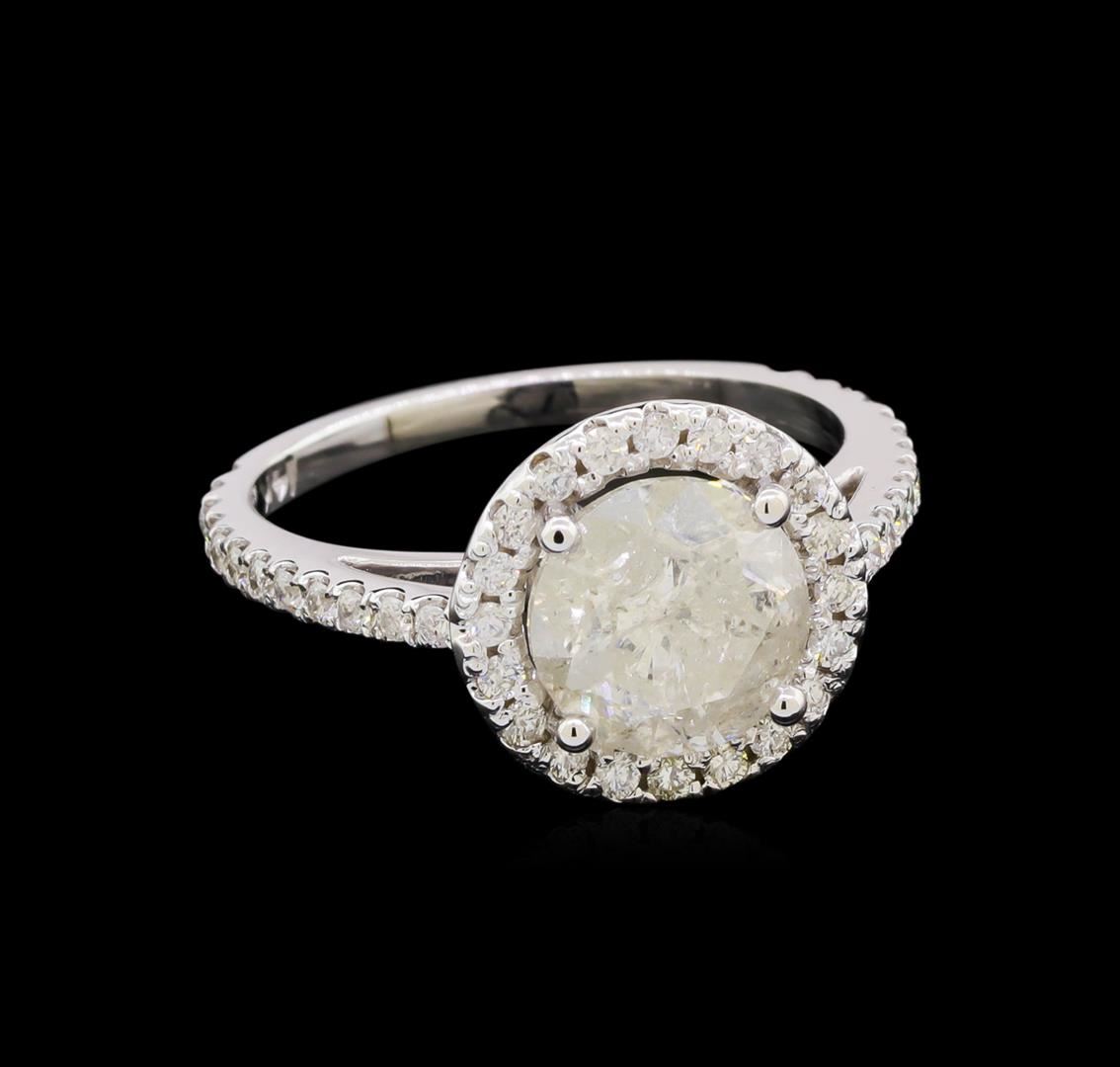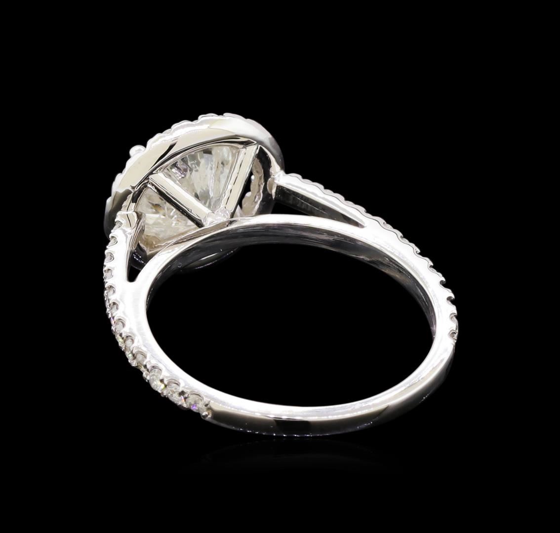 One electronically tested 14KT white gold lady's cast wedding ring with a cathedral halo with a bright polish finish. The featured lady's ring has a shank measuring 1.61 millimeters wide. Identified with markings of "14K". Condition is new, good workmanship. Containing: One prong set round brilliant cut diamond, measuring 7.93 - 7.92 x 5.40mm (depth est.) , 10.00.%. GTCF approximate weight of 2.28ct. Graded in the setting. Clarity: I-3. Color: I - J. Cut Good Forty-Four prong set round brilliant cut diamonds, measuring 1.40 - 1.30 x 0.82mm (depth est.) approximate total weight of 44 Stones = 0.40ct. Graded in the setting. Clarity: SI-1 to I-1. Color: G - I. Cut Good. Total Weight of Diamonds 2.68ct. Total Weight of Ring 3.40gm. GAS Appraised at $7,480.00.