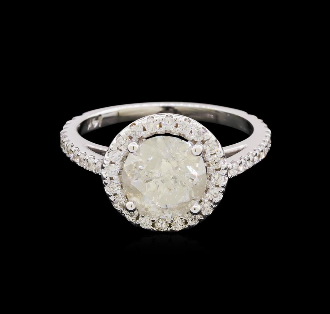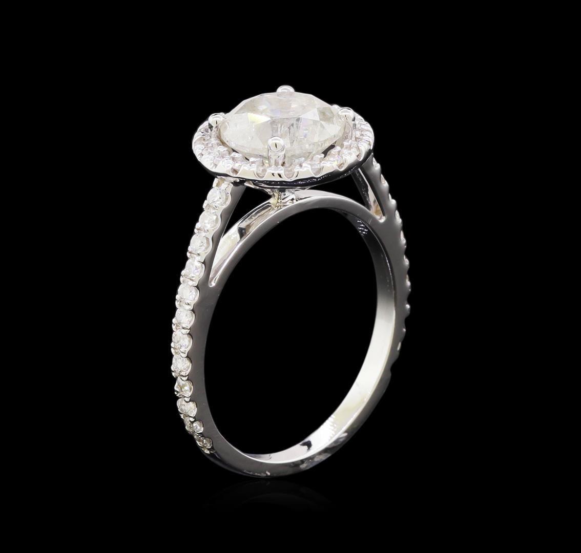 One electronically tested 14KT white gold lady's cast wedding ring with a cathedral halo with a bright polish finish. The featured lady's ring has a shank measuring 1.61 millimeters wide. Identified with markings of "14K". Condition is new, good workmanship. Containing: One prong set round brilliant cut diamond, measuring 7.93 - 7.92 x 5.40mm (depth est.) , 10.00.%. GTCF approximate weight of 2.28ct. Graded in the setting. Clarity: I-3. Color: I - J. Cut Good Forty-Four prong set round brilliant cut diamonds, measuring 1.40 - 1.30 x 0.82mm (depth est.) approximate total weight of 44 Stones = 0.40ct. Graded in the setting. Clarity: SI-1 to I-1. Color: G - I. Cut Good. Total Weight of Diamonds 2.68ct. Total Weight of Ring 3.40gm. GAS Appraised at $7,480.00.