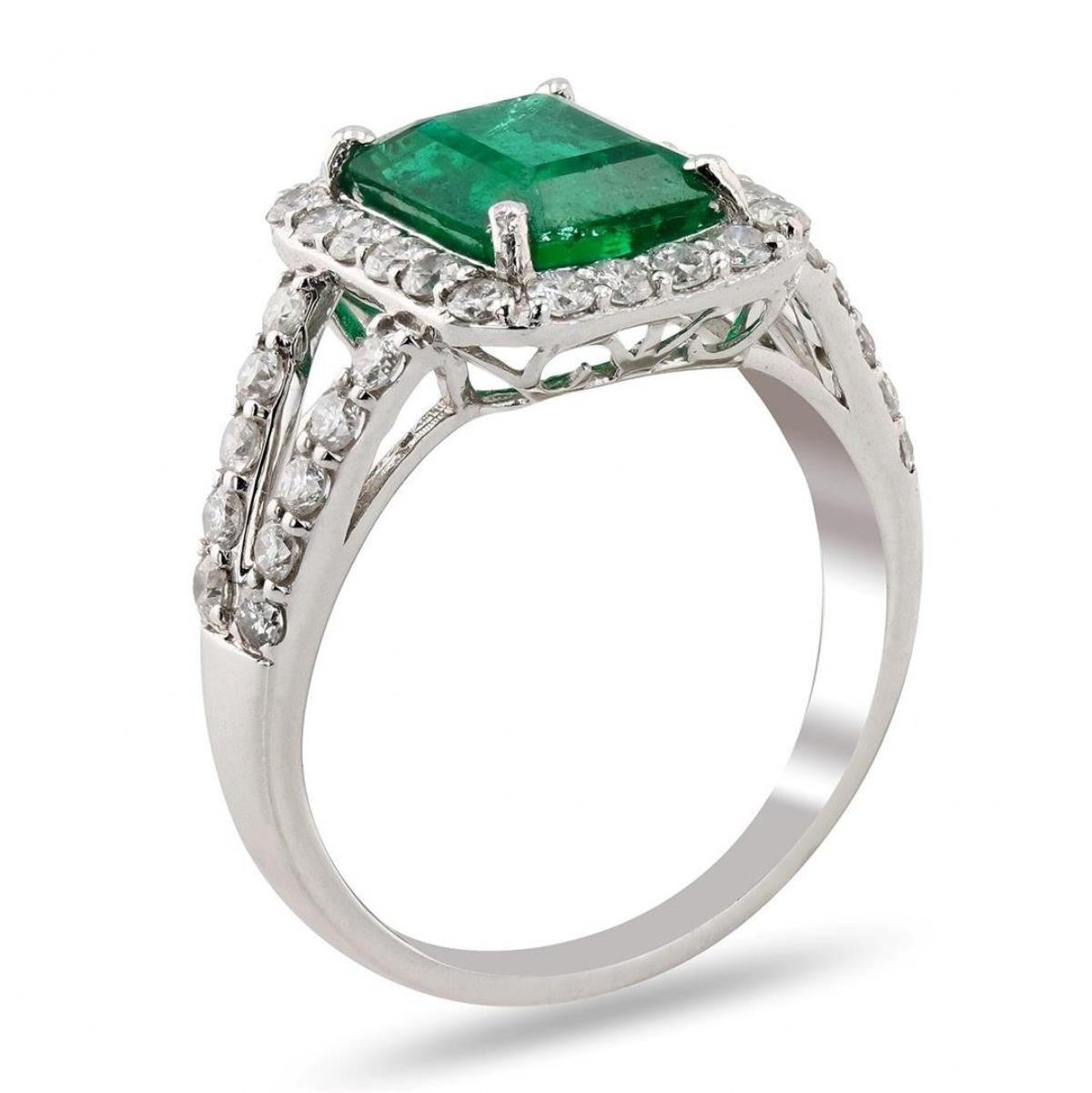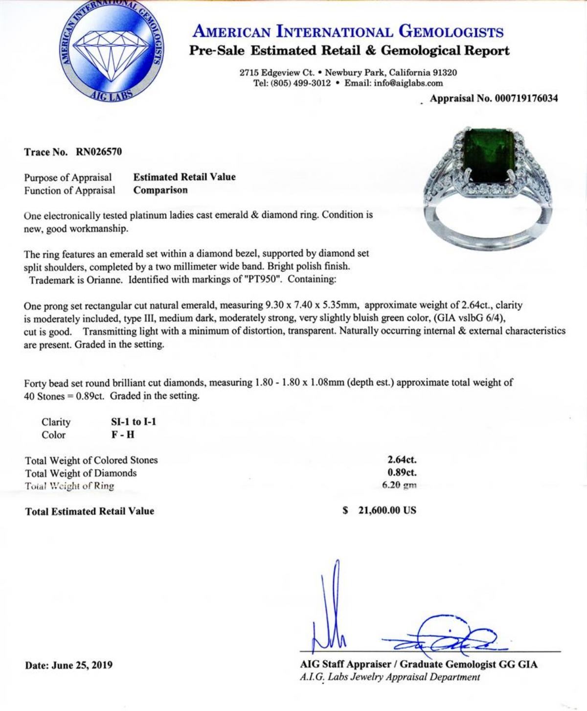 One electronically tested platinum ladies cast emerald & diamond ring. Condition is new, good workmanship. The ring features an emerald set within a diamond bezel, supported by diamond set split shoulders, completed by a two millimeter wide band. Bright polish finish. Trademark is Orianne. Identified with markings of "PT950". Containing: One prong set rectangular cut natural emerald, measuring 9.30 x 7.40 x 5.35mm, approximate weight of 2.64ct., clarity is moderately included, type III, medium dark, moderately strong, very slightly bluish green color, (GIA vslbG 6/4), cut is good. Transmitting light with a minimum of distortion, transparent. Naturally occurring internal & external characteristics are present. Graded in the setting. Forty bead set round brilliant cut diamonds, measuring 1.80 - 1.80 x 1.08mm (depth est.) approximate total weight of 40 Stones = 0.89ctw. Graded in the setting. Clarity SI-1 to I-1 Color F - H Total Weight of Colored Stones 2.64ct. Total Weight of Diamonds 0.89ctw. Total Weight of Ring 6.20 gm