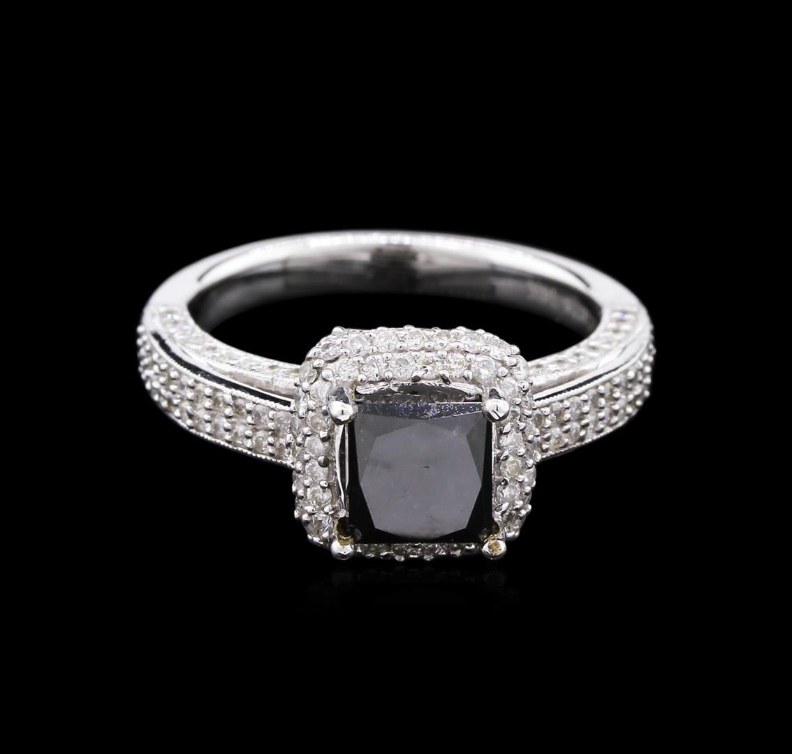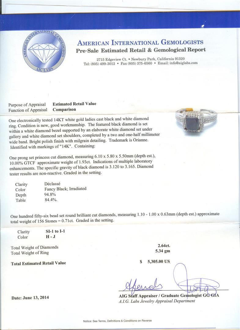 One electronically tested 14KT white gold ladies cast black and white diamond ring. The featured black diamond is set within a white diamond bezel supported by an elaborate white diamond set under gallery and white diamond set shoulders, completed by a two and one-half millimeter wide band. Bright polish finish with milgrain detailing. Trademark is Orianne. Identified with markings of "14K". Condition is new, good workmanship. Containing: One prong set princess cut diamond, measuring 6.10 x 5.80 x 5.50mm (depth est.), 10.00.%. GTCF approximate weight of 1.93ct. Indications of multiple laboratory enhancements. The specific gravity of black diamond is 3.120 to 3.165. Diamond tester results are non-reactive. Graded in the setting. Clarity Déclassé‚. Color: Fancy Black; Irradiated. Depth: 94.8%. Table: 84.4%. One Hundred Fifty-Six bead set round brilliant cut diamonds, measuring 1.10 - 1.00 x 0.63mm (depth est.) approximate total weight of 156 Stones = 0.71ct. Graded in the setting. Clarity: SI-1 to I-1. Color: H - J. Total Weight of Diamonds 2.64ct. AIG Appraised at $5,305.00.