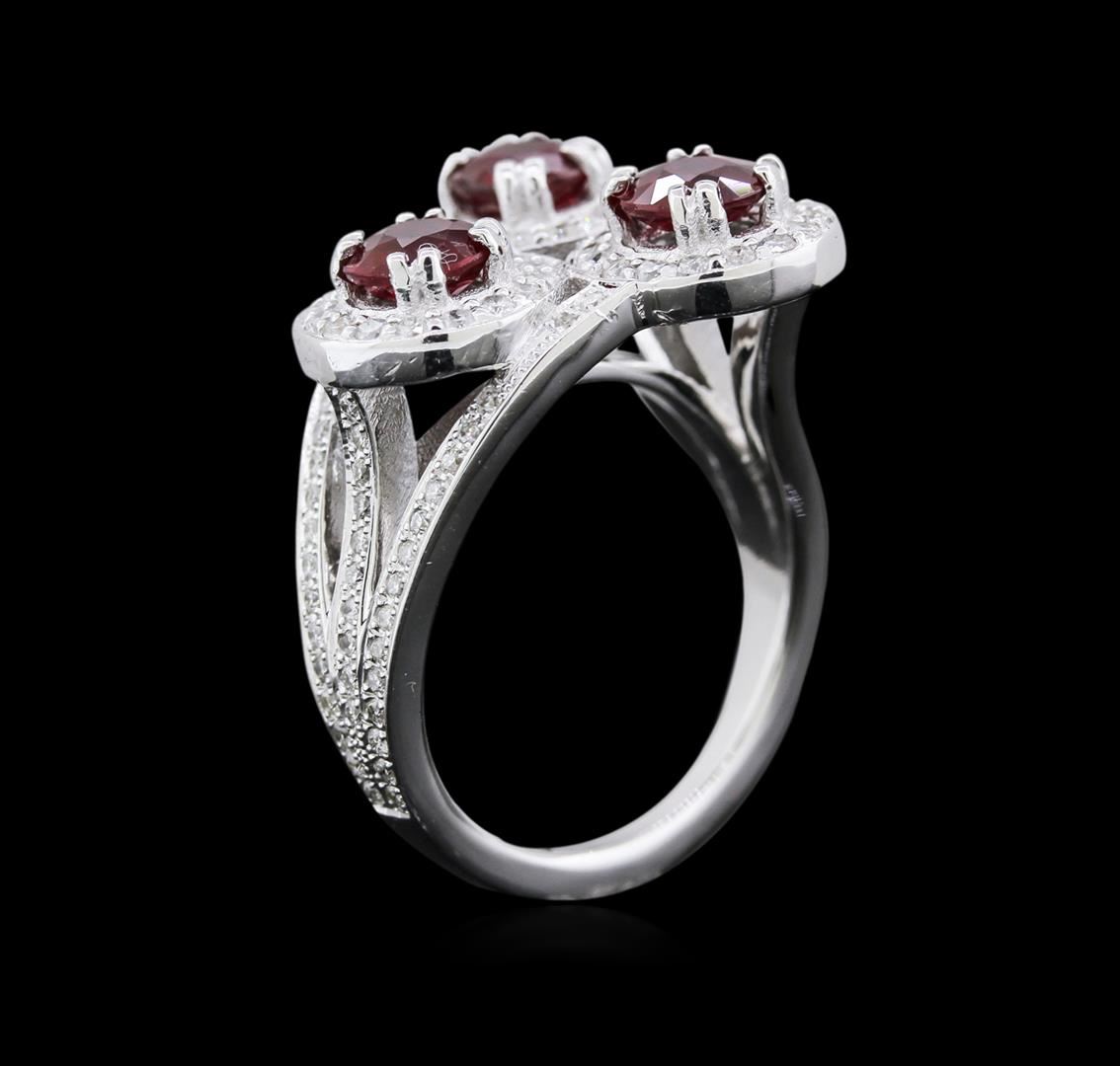 One electronically tested 14KT white gold ladies cast ruby and diamond ring with a bright polish finish. Identified with markings of "14K". Condition is new. Containing: Three prong set round modified brilliant cut natural rubies, measuring 5.50 - 5.50 x 3.58 mm, approximate total weight of 2.64ct., clarity is moderately included, type II, medium dark, moderately strong, strongly purplish red color, (GIA stpR 6/4), cut is very good. One Hundred Twenty-Eight prong set round brilliant cut diamonds, measuring 1.30 - 1.10 x 0.72mm (depth est.) approximate total weight of 128 Stones = 0.81ct. Clarity: I-1 to I-2. Color: G - H, Cut is Good. Colored gemstones are presumed to have been subjected to commonly used enhancement processes. All diamonds and colored gemstones are graded in the mounting, unless otherwise stated. Total Weight of Colored Stones 2.64ct. Total Weight of Diamonds 0.81ct. Total Weight of Ring 8.90gm. GGL Appraised at $2,705.00.