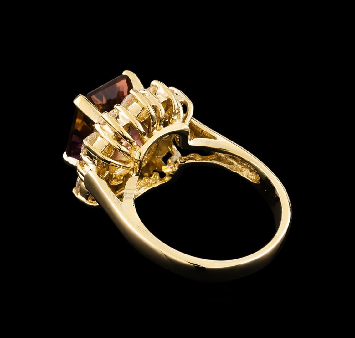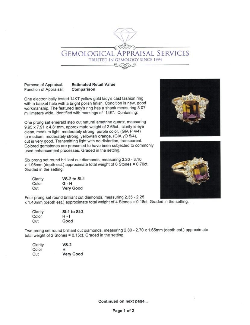 One electronically tested 14KT yellow gold lady's cast fashion ring with a basket halo with a bright polish finish. The featured lady's ring has a shank measuring 3.07 millimeters wide. Identified with markings of "14K". Condition is new, good workmanship. Containing: One prong set emerald step cut natural ametrine quartz, measuring 9.95 x 7.91 x 4.81mm, approximate weight of 2.65ct., clarity is eye clean, medium light, moderately strong, purple color, (GIA P 4/4) to medium, moderately strong, yellowish orange, (GIA yO 5/4), cut is very good. Transmitting light with no distortion, transparent. Colored gemstones are presumed to have been subjected to commonly used enhancement processes. Graded in the setting. Six prong set round brilliant cut diamonds, measuring 3.20 - 3.10 x 1.95mm (depth est.) approximate total weight of 6 Stones = 0.70ct. Graded in the setting. Clarity: VS-2 to SI-1. Color: G - Very Good Four prong set round brilliant cut diamonds, measuring 2.35 - 2.25 x 1.40mm (depth est.) approximate total weight of 4 Stones = 0.18ct. Graded in the setting. Clarity: SI-1 to SI-2. Color: H - I. Cut Good Two prong set round brilliant cut diamonds, measuring 2.80 - 2.70 x 1.65mm (depth est.) approximate total weight of 2 Stones = 0.15ct. Graded in the setting. Clarity: VS-2. Color: Very Good. Total Weight of Colored Stones 2.65ct. Total Weight of Diamonds 1.03ct. Total Weight of Ring 7.00gm. GAS Appraised at $4,140.00.
