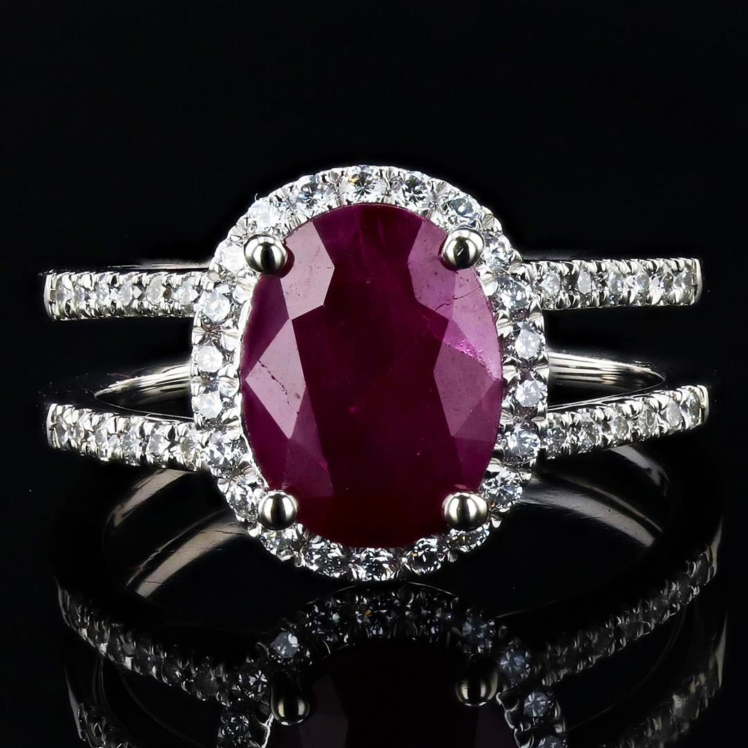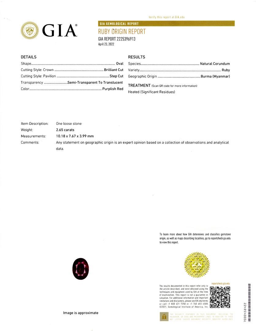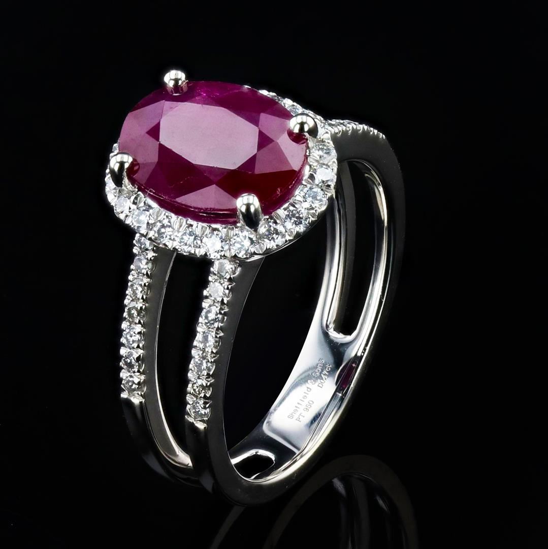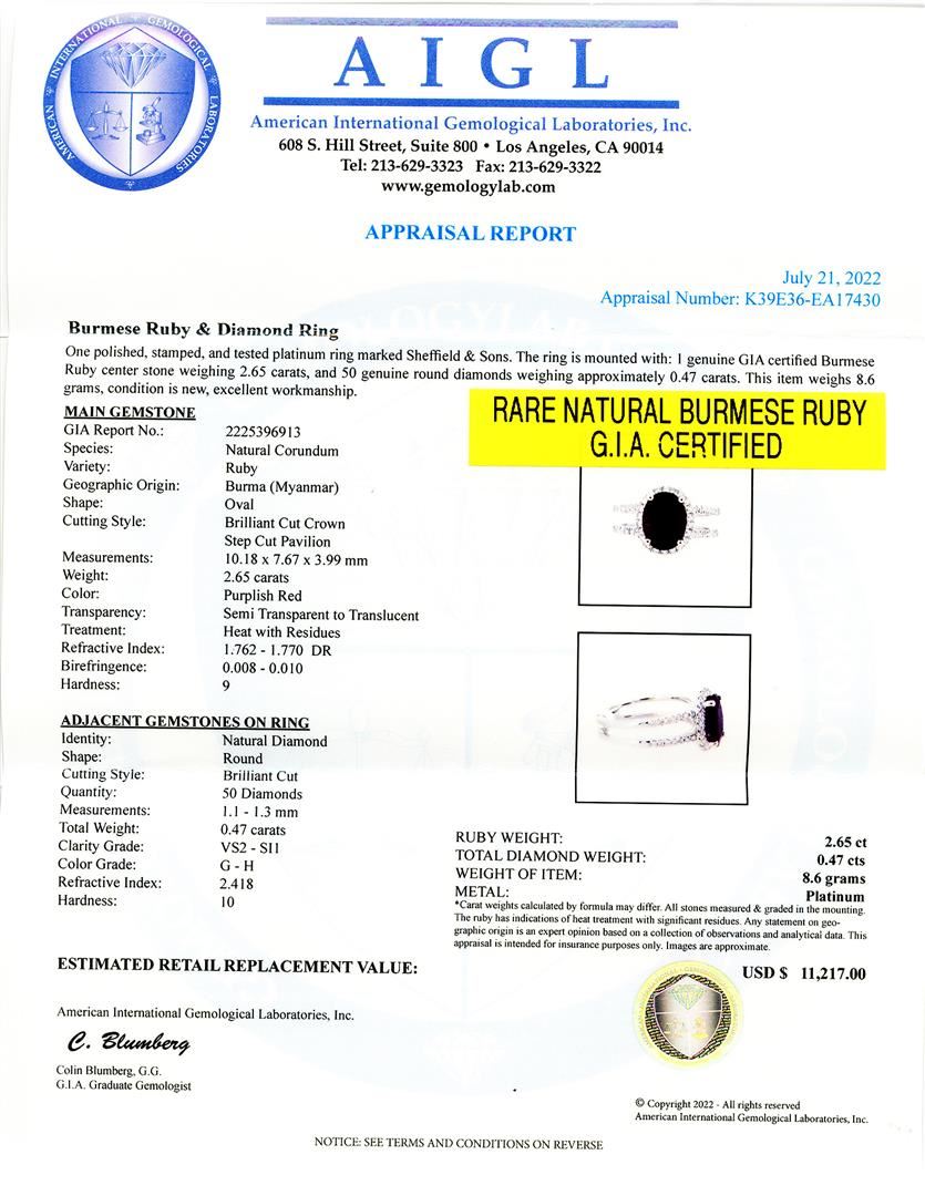 One polished, stamped, and tested platinum ring marked Sheffield & Sons. The ring is mounted with: 1 genuine GIA certified Burmese Ruby center stone weighing 2.65 carats, and 50 genuine round diamonds weighing approximately 0.47 carats. This item weighs 8.6 grams, condition is new, excellent workmanship. #MAIN GEMSTONE# GIA Report No.: 2225396913 Species: Natural Corundum Variety: Ruby Geographic Origin: Burma (Myanmar) Shape: Oval Cutting Style: Brilliant Cut Crown, Step Cut Pavilion Measurements: 10.18 x 7.67 x 3.99mm Weight: 2.65 carats Color: Purplish Red Transparency: Semi Transparent to Translucent Treatment: Heat with Residues Refractive Index: 1.762 - 1.770 DR Birefringence: 0.008 - 0.010 Hardness: 9 #ADJACENT GEMSTONES ON RING# Identity: Natural Diamond Shape: Round Cutting Style: Brilliant Cut Quantity: 50 Diamonds Measurements: 1.1 - 1.3mm Total Weight: 0.47 carats Clarity Grade: VS2 - SI1 Color Grade: G - H Refractive Index: 2.418 Hardness: 10 RUBY WEIGHT: 2.65 ct TOTAL DIAMOND WEIGHT: 0.47 cts WEIGHT OF ITEM: 8.6 grams METAL: Platinum