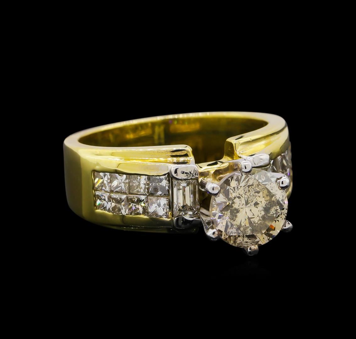 One 18KT yellow and white gold ring weighing 9.07 grams, featuring one center diamond with I clarity and L-K color weighing 1.55ct, and adjacent princess and baguette cut diamonds with SI clarity and G-H color weighing 1.10ctw RBGS Appraised at $12,000.00.