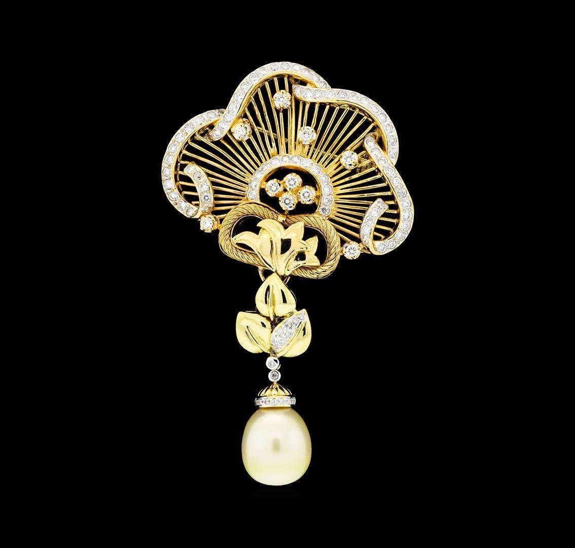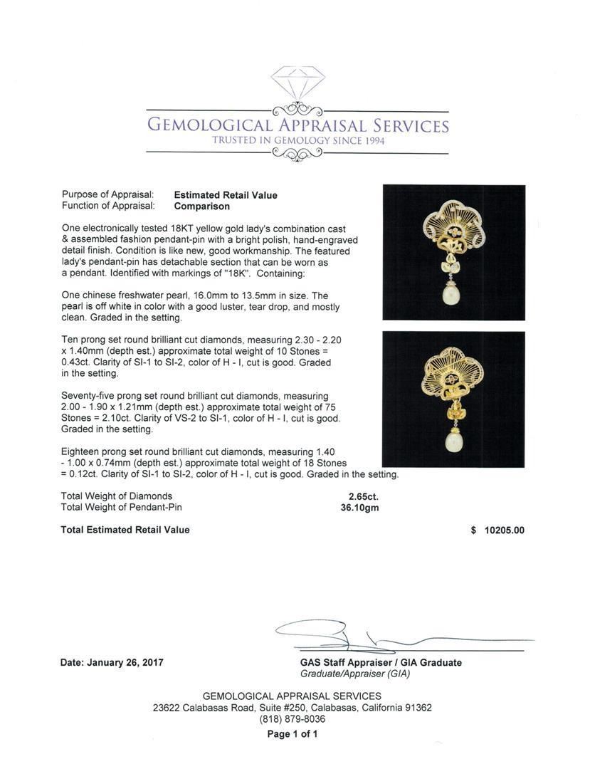 One electronically tested 18KT yellow gold lady's combination cast & assembled fashion pendant-pin with a bright polish, hand-engraved detail finish. The featured lady's pendant-pin has detachable section that can be worn as a pendant. Identified with markings of '18K'. Condition is like new, good workmanship. Containing: One chinese freshwater pearl, 16.0mm to 13.5mm in size. The pearl is off white in color with a good luster, tear drop, and mostly clean. Graded in the setting. Ten prong set round brilliant cut diamonds, measuring 2.30 - 2.20 x 1.40mm (depth est.) approximate total weight of 10 Stones = 0.43ct. Graded in the setting. Color H - I Clarity SI-1 to SI-2 Cut Good Seventy-Five prong set round brilliant cut diamonds, measuring 2.00 - 1.90 x 1.21mm (depth est.) approximate total weight of 75 Stones = 2.10 ct. Graded in the setting. Color H - I Clarity VS-2 to SI-1 Cut Good Eighteen prong set round brilliant cut diamonds, measuring 1.40 - 1.00 x 0.74mm (depth est.) approximate total weight of 18 Stones = 0.12ct. Graded in the setting. Color H - I Clarity SI-1 to SI-2 Cut Good. Total Weight of Diamonds 2.65ct.. Total Weight of Pendant-Pin 36.10gm. GAS Appraised.