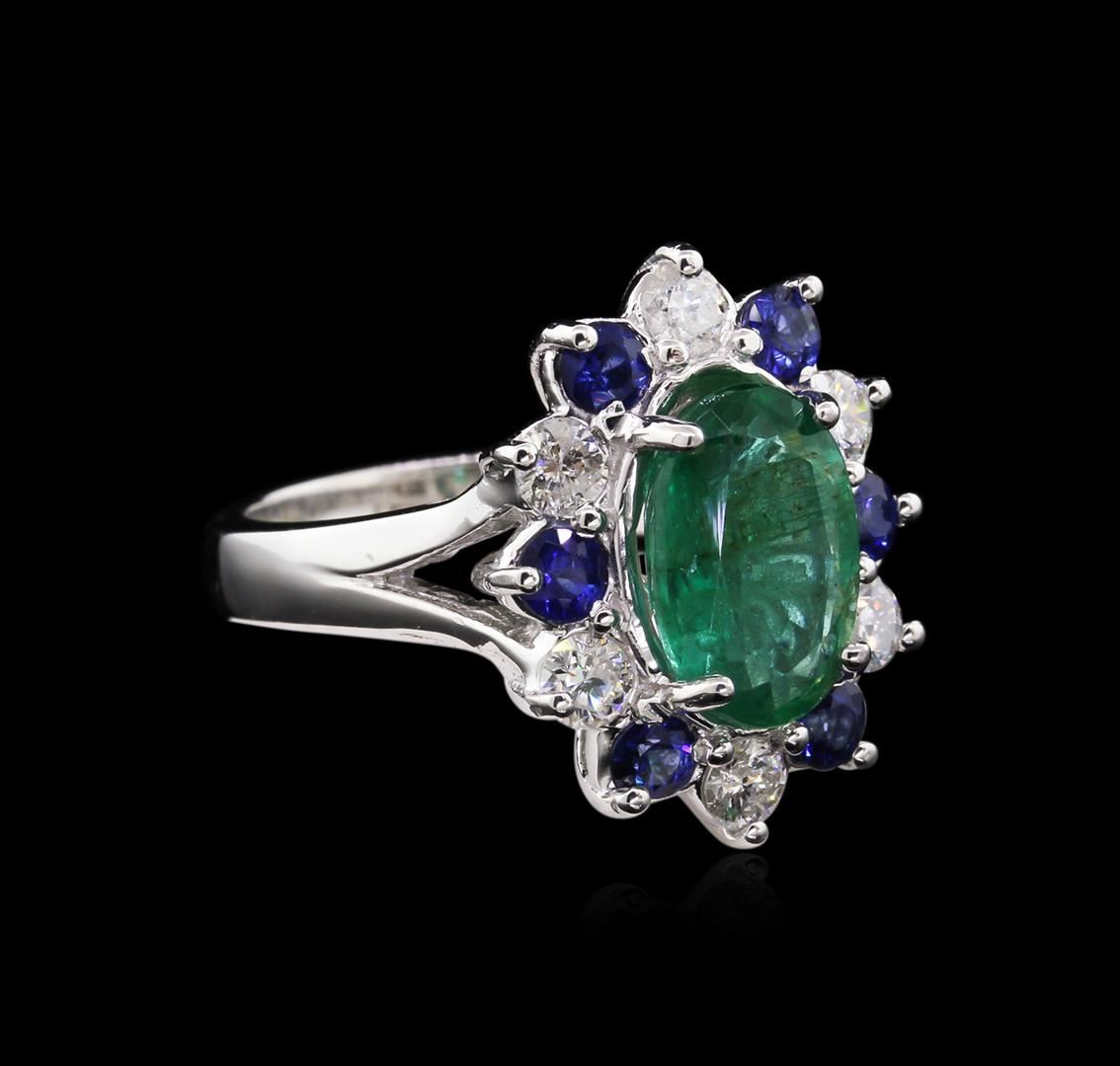 One electronically tested 14KT white gold lady's cast fashion ring with a split shank with a bright polish finish. The featured ring has a shank measuring 3.00 millimeters in width. Identified with markings of "14K". Condition is new, good workmanship. Containing: One prong set oval modified brilliant cut natural emerald, measuring 10.91 x 7.47 x 4.57mm, 20% bulge factor, approximate weight of 2.65ct., clarity is moderately included, type III, medium, strong, green color, (GIA G 5/5), cut is good. Transmitting light somewhat diffusely, transparent to translucent. Indications of oil residue. Naturally occurring internal & external characteristics are present. Graded in the setting. Six prong set round standard brilliant cut natural blue sapphires, measuring 3.00 - 2.90 x 1.77 mm, approximate total weight of 0.75ct., clarity is moderately included, type II, medium dark, moderately strong, blue color, (GIA B 6/4), cut is good. Colored gemstones are presumed to have been subjected to commonly used enhancement processes. Graded in the setting. Six prong set round brilliant cut diamonds, measuring 3.20 - 3.10 x 2.05mm (depth est.) approximate total weight of 6 Stones = 0.75ct. Graded in the setting. Clarity: SI-2 to I-1. Color: H - I. Cut Good. Total Weight of Colored Stones 3.40ct. Total Weight of Diamonds 0.75ct. Total Weight of Ring 7.60gm. GAS Appraised at $7,780.00.