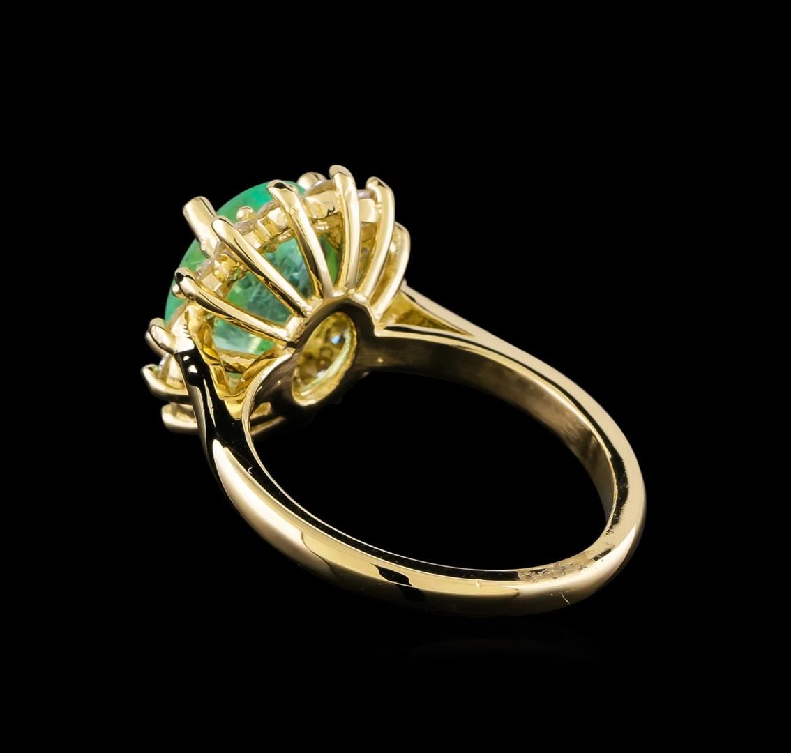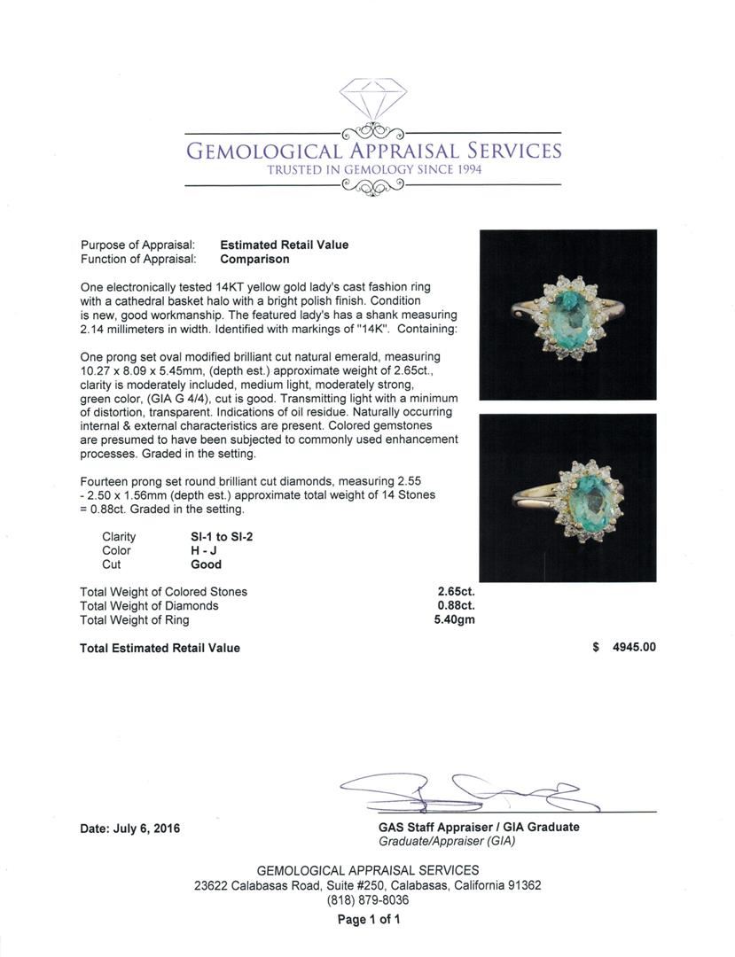 One electronically tested 14KT yellow gold lady's cast fashion ring with a cathedral basket halo with a bright polish finish. The featured lady's has a shank measuring 2.14 millimeters in width. Identified with markings of "14K". Condition is new, good workmanship. Containing: One prong set oval modified brilliant cut natural emerald, measuring 10.27 x 8.09 x 5.45mm, (depth est.) approximate weight of 2.65ct., clarity is moderately included, medium light, moderately strong, green color, (GIA G 4/4), cut is good. Transmitting light with a minimum of distortion, transparent. Indications of oil residue. Naturally occurring internal & external characteristics are present. Colored gemstones are presumed to have been subjected to commonly used enhancement processes. Graded in the setting. Fourteen prong set round brilliant cut diamonds, measuring 2.55 - 2.50 x 1.56mm (depth est.) approximate total weight of 14 Stones = 0.88ct. Graded in the setting. Clarity: SI-1 to SI-2. Color: H - Good. Total Weight of Colored Stones 2.65ct. Total Weight of Diamonds 0.88ct. Total Weight of Ring 5.40gm. GAS Appraised.