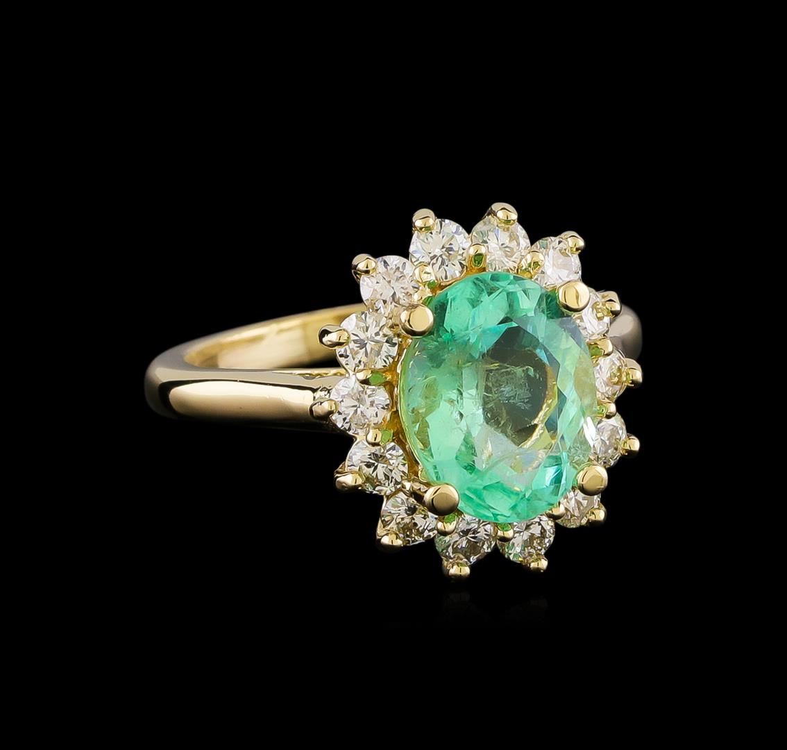 One electronically tested 14KT yellow gold lady's cast fashion ring with a cathedral basket halo with a bright polish finish. The featured lady's has a shank measuring 2.14 millimeters in width. Identified with markings of "14K". Condition is new, good workmanship. Containing: One prong set oval modified brilliant cut natural emerald, measuring 10.27 x 8.09 x 5.45mm, (depth est.) approximate weight of 2.65ct., clarity is moderately included, medium light, moderately strong, green color, (GIA G 4/4), cut is good. Transmitting light with a minimum of distortion, transparent. Indications of oil residue. Naturally occurring internal & external characteristics are present. Colored gemstones are presumed to have been subjected to commonly used enhancement processes. Graded in the setting. Fourteen prong set round brilliant cut diamonds, measuring 2.55 - 2.50 x 1.56mm (depth est.) approximate total weight of 14 Stones = 0.88ct. Graded in the setting. Clarity: SI-1 to SI-2. Color: H - Good. Total Weight of Colored Stones 2.65ct. Total Weight of Diamonds 0.88ct. Total Weight of Ring 5.40gm. GAS Appraised.