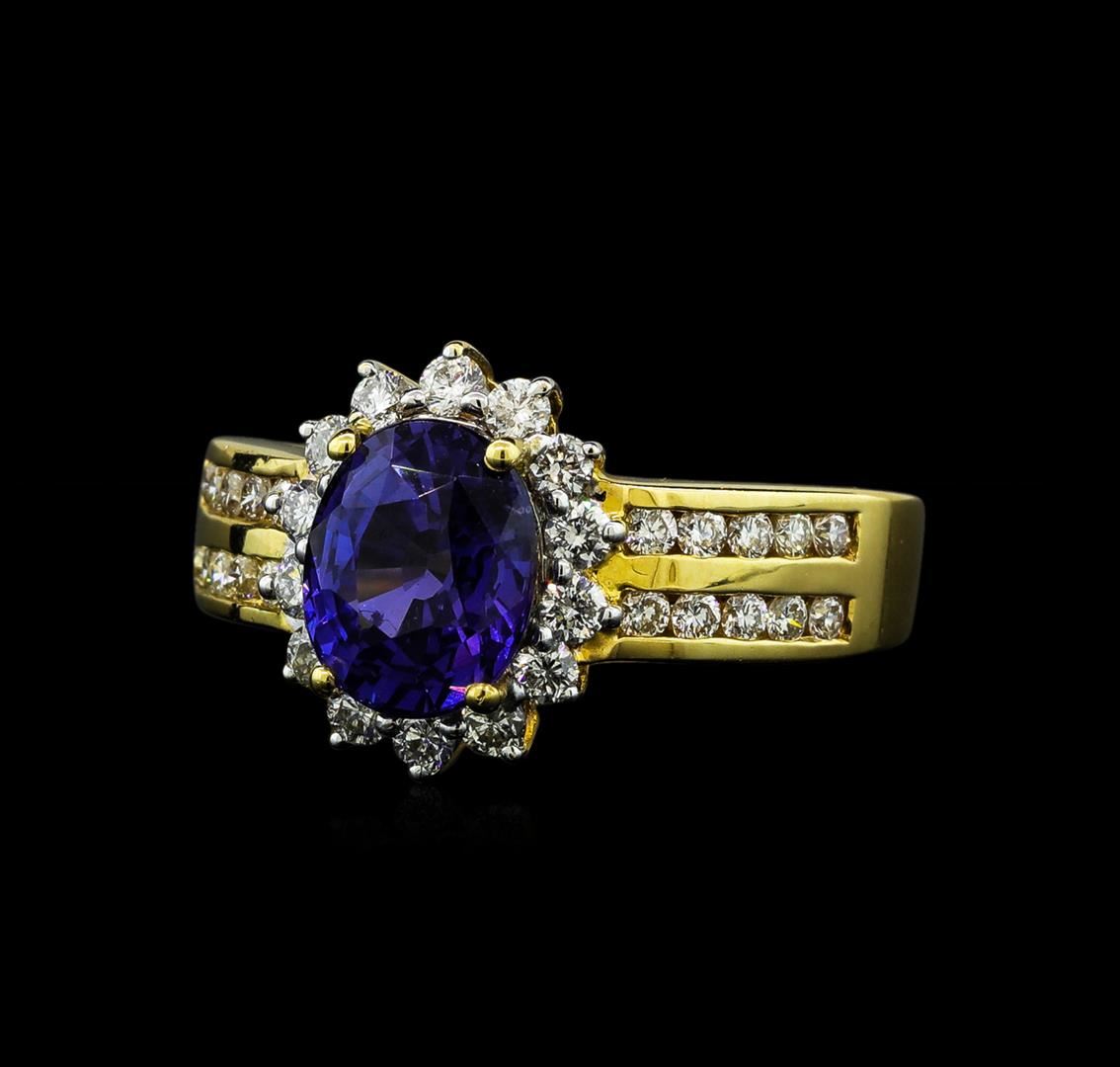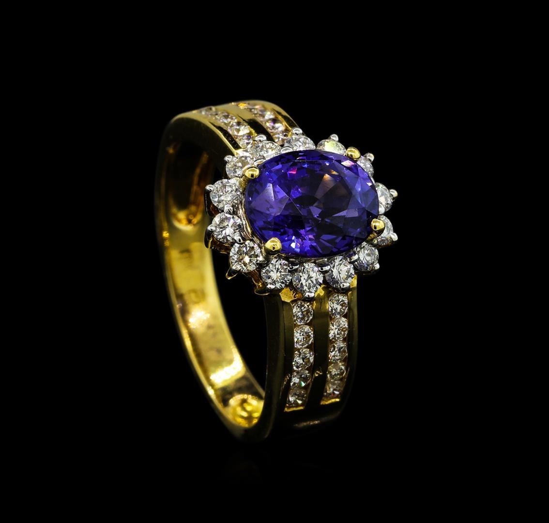 One electronically tested 18KT yellow gold lady's cast fashion ring with a basket halo with a bright polish finish. The featured lady's ring has a shank measuring 2.95 millimeters wide. Identified with markings of '18K'. Condition is new, good workmanship. Containing: One prong set oval modified brilliant cut natural color change sapphire, measuring 7.07 x 8.48 x 5.11mm, (depth est.) 3%. bulge factor, approximate weight of 2.65ct., clarity is eye clean, medium dark, strong, blue color, (GIA B 6/5) to medium dark, strong, bluish purple, (GIA bP 6/5), cut is very good. Transmitting light with no distortion, transparent. No indications of heat treatment. Graded loose prior to setting in the TGL Laboratory, Report #24010424. Fourteen prong set round brilliant cut diamonds, measuring 2.00 - 1.90 x 1.21mm (depth est.) approximate total weight of 14 Stones = 0.40ct. Graded in the setting. Clarity VS-2 to SI-1. Color: F - G Cut Very Good Twenty channel set round brilliant cut diamonds, measuring 1.60 - 1.50 x 0.96mm (depth est.) approximate total weight of 20 Stones = 0.28ct. Graded in the setting. Clarity VS-2 to SI-1. Color: G - H Cut Very Good. Total Weight of Colored Stones 2.65ct.. Total Weight of Diamonds 0.68ct.. Total Weight of Ring 4.90gm GAS Appraised at $17,220.00.