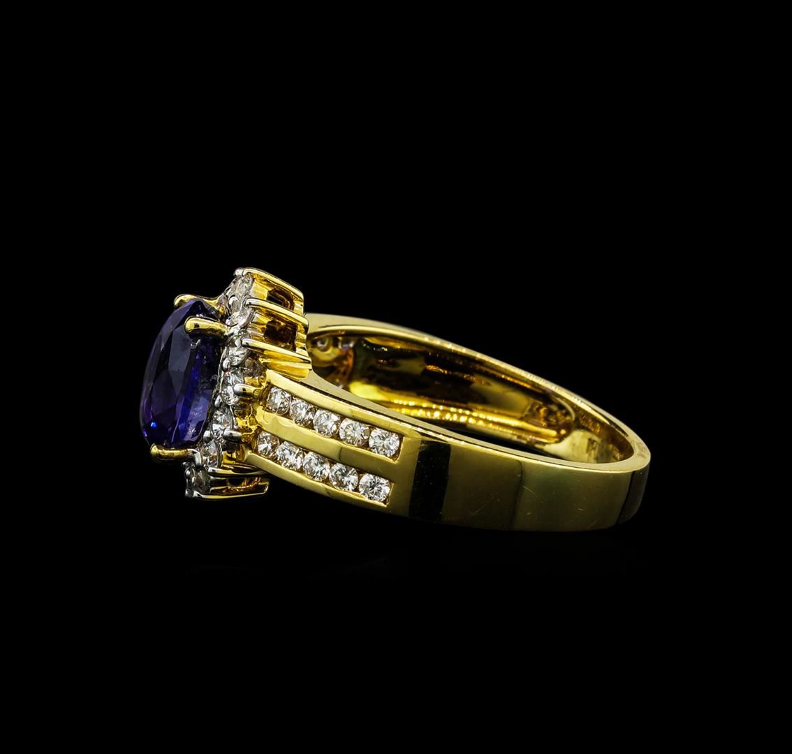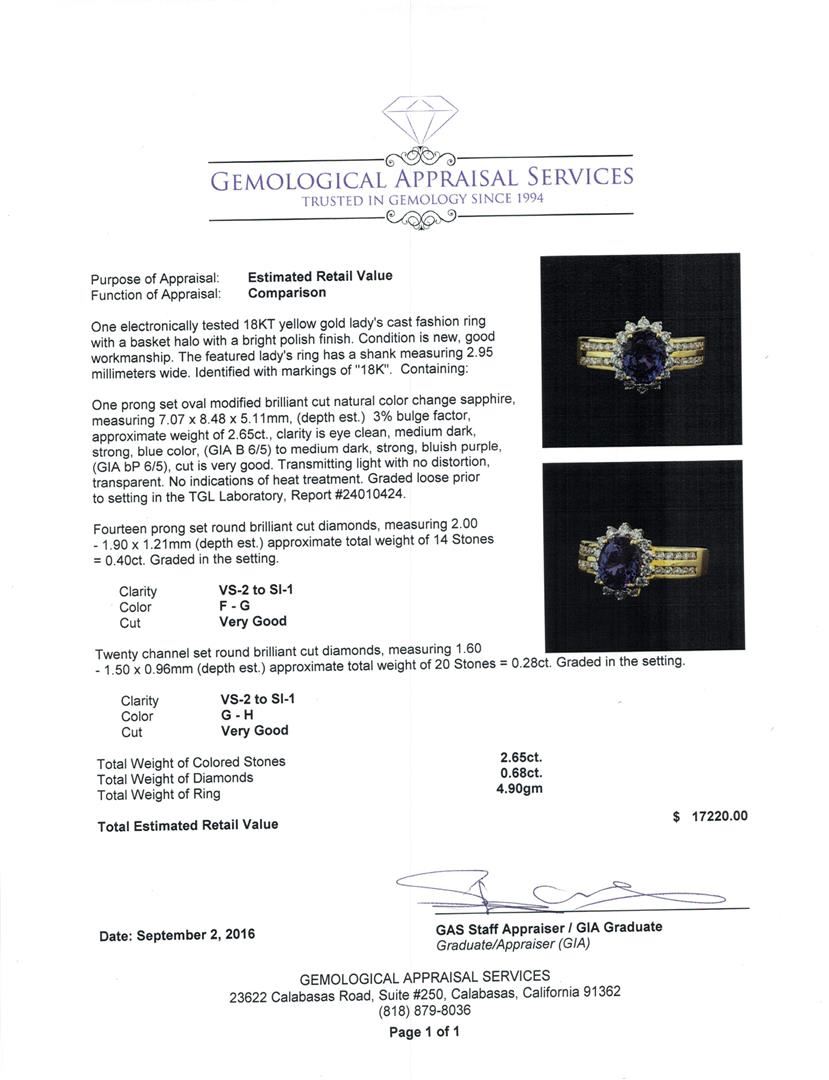 One electronically tested 18KT yellow gold lady's cast fashion ring with a basket halo with a bright polish finish. The featured lady's ring has a shank measuring 2.95 millimeters wide. Identified with markings of '18K'. Condition is new, good workmanship. Containing: One prong set oval modified brilliant cut natural color change sapphire, measuring 7.07 x 8.48 x 5.11mm, (depth est.) 3%. bulge factor, approximate weight of 2.65ct., clarity is eye clean, medium dark, strong, blue color, (GIA B 6/5) to medium dark, strong, bluish purple, (GIA bP 6/5), cut is very good. Transmitting light with no distortion, transparent. No indications of heat treatment. Graded loose prior to setting in the TGL Laboratory, Report #24010424. Fourteen prong set round brilliant cut diamonds, measuring 2.00 - 1.90 x 1.21mm (depth est.) approximate total weight of 14 Stones = 0.40ct. Graded in the setting. Clarity VS-2 to SI-1. Color: F - G Cut Very Good Twenty channel set round brilliant cut diamonds, measuring 1.60 - 1.50 x 0.96mm (depth est.) approximate total weight of 20 Stones = 0.28ct. Graded in the setting. Clarity VS-2 to SI-1. Color: G - H Cut Very Good. Total Weight of Colored Stones 2.65ct.. Total Weight of Diamonds 0.68ct.. Total Weight of Ring 4.90gm GAS Appraised at $17,220.00.
