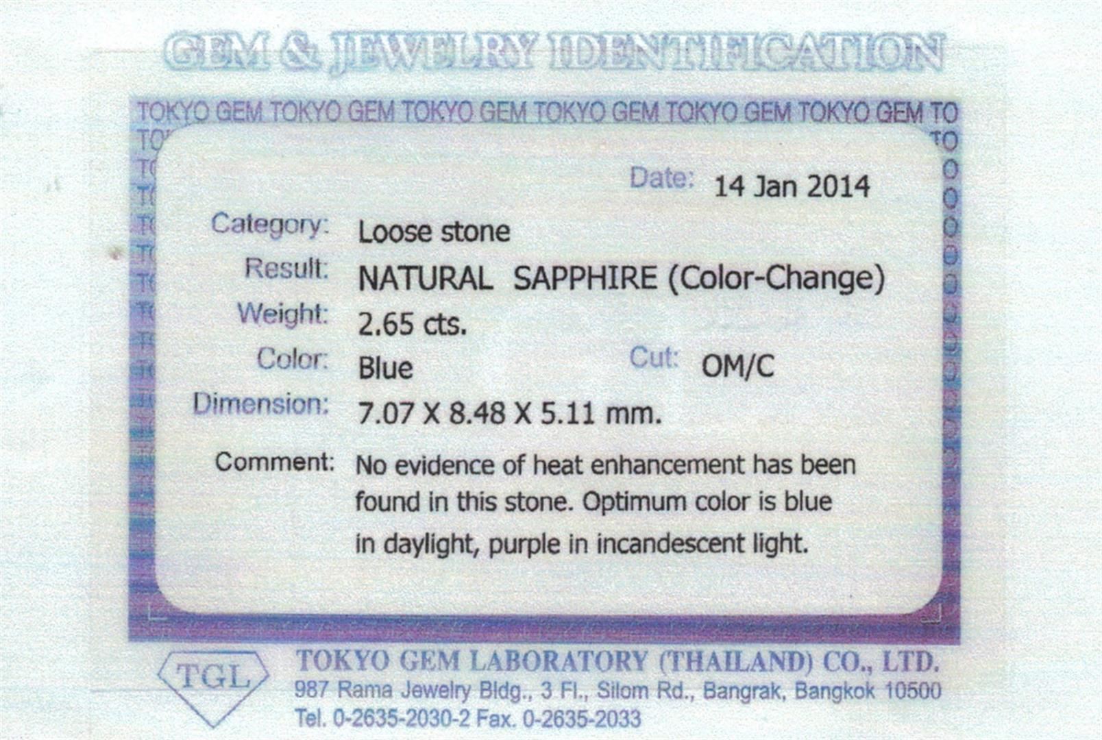 One electronically tested 18KT yellow gold lady's cast fashion ring with a basket halo with a bright polish finish. The featured lady's ring has a shank measuring 2.95 millimeters wide. Identified with markings of '18K'. Condition is new, good workmanship. Containing: One prong set oval modified brilliant cut natural color change sapphire, measuring 7.07 x 8.48 x 5.11mm, (depth est.) 3%. bulge factor, approximate weight of 2.65ct., clarity is eye clean, medium dark, strong, blue color, (GIA B 6/5) to medium dark, strong, bluish purple, (GIA bP 6/5), cut is very good. Transmitting light with no distortion, transparent. No indications of heat treatment. Graded loose prior to setting in the TGL Laboratory, Report #24010424. Fourteen prong set round brilliant cut diamonds, measuring 2.00 - 1.90 x 1.21mm (depth est.) approximate total weight of 14 Stones = 0.40ct. Graded in the setting. Clarity VS-2 to SI-1. Color: F - G Cut Very Good Twenty channel set round brilliant cut diamonds, measuring 1.60 - 1.50 x 0.96mm (depth est.) approximate total weight of 20 Stones = 0.28ct. Graded in the setting. Clarity VS-2 to SI-1. Color: G - H Cut Very Good. Total Weight of Colored Stones 2.65ct.. Total Weight of Diamonds 0.68ct.. Total Weight of Ring 4.90gm GAS Appraised at $17,220.00.