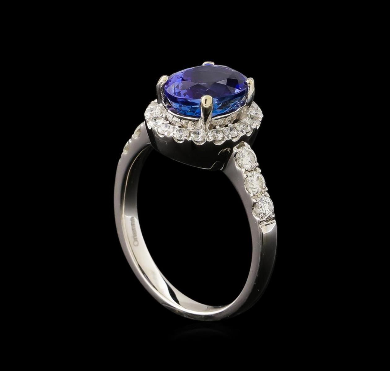 One electronically tested 14KT white gold ladies cast tanzanite and diamond ring with a bright polish finish. The featured tanzanite is set within a diamond bezel supported by diamond set shoulders, completed by a two and one-half millimeter wide band. Trademark is Orianne. Identified with markings of "14K". Condition is new, good workmanship. Containing: One prong set oval mixed cut natural tanzanite, measuring 9.25 x 7.25 x 5.30mm, 6%. bulge factor, approximate weight of 2.65ct., clarity is eye clean, type I, medium dark, very slightly grayish, bluish violet color, (GIA bV 6/3), cut is good. Transmitting light with no distortion, transparent. Graded in the setting. Tanzanite is a very rare gemstone that is only found in the country of Tanzania. Originally discovered in 1967. Tiffany & Company, named the stone Tanzanite. It is found in the Usumburu Mountains that border the Umba Valley of northern Tanzania. Tanzanite occurs in gray, brown, violet, blue, reddish-purple, & green. The gem is interesting because of its exceptional pleochroism. Rotated in different directions a tanzanite will exhibit multiple changes of color. Tanzanite has a low tolerance to ultrasonic cleaning, and should not be cleaned using this method. Six prong set round brilliant cut diamonds, measuring 2.60 - 2.50 x 1.53mm (depth est.) approximate total weight of 6 Stones = 0.46ct. Graded in the setting. Clarity: I-1 to I-2. Color: G - I Eighteen prong set round brilliant cut diamonds, measuring 1.60 - 1.50 x 0.93mm (depth est.) approximate total weight of 18 Stones = 0.34ct. Graded in the setting. Clarity: I-2 to I-3. Color: G - I. Total Weight of Colored Stones 2.65ct. Total Weight of Diamonds 0.80ct. Total Weight of Ring 4.63gm.