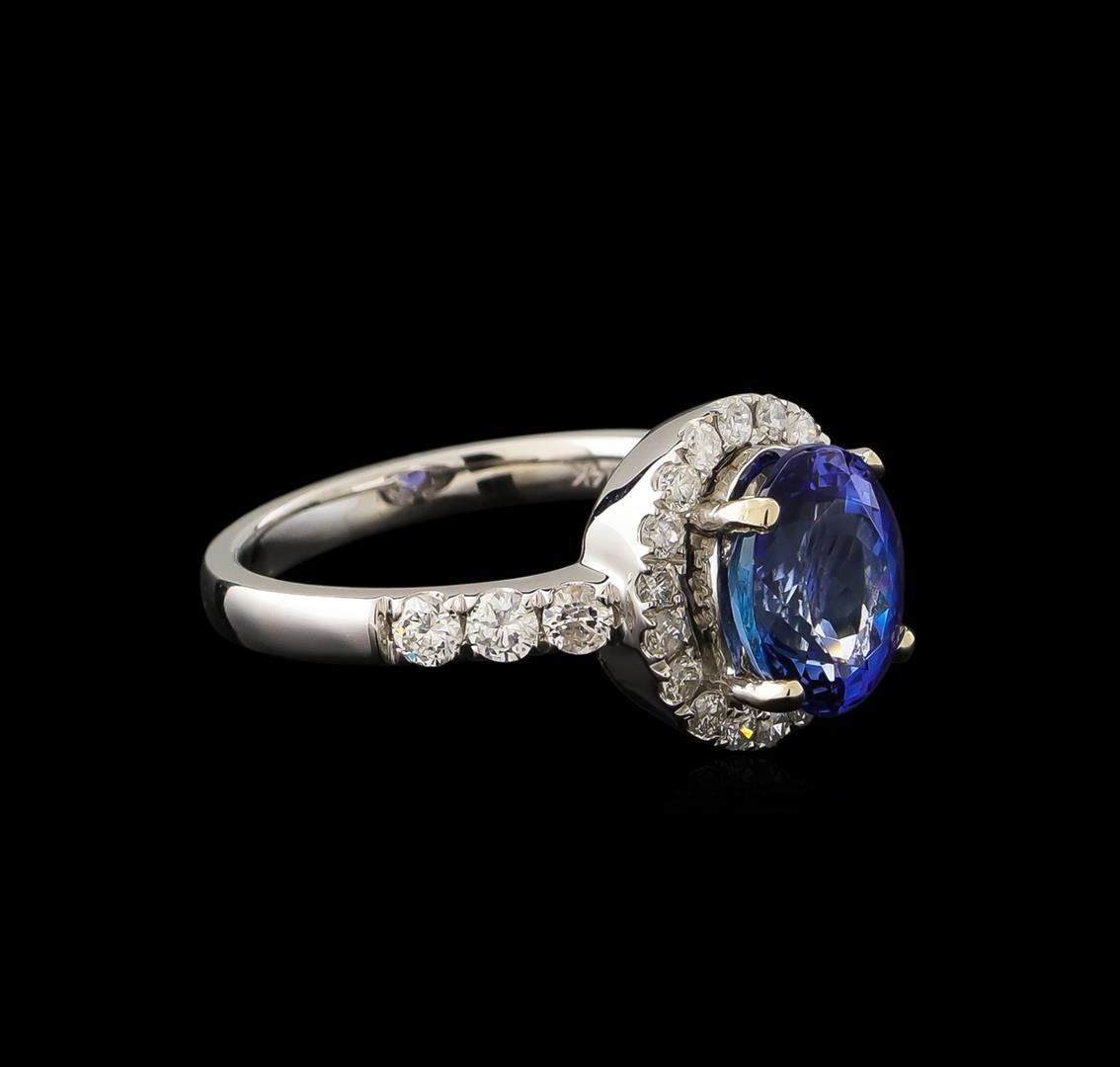One electronically tested 14KT white gold ladies cast tanzanite and diamond ring with a bright polish finish. The featured tanzanite is set within a diamond bezel supported by diamond set shoulders, completed by a two and one-half millimeter wide band. Trademark is Orianne. Identified with markings of "14K". Condition is new, good workmanship. Containing: One prong set oval mixed cut natural tanzanite, measuring 9.25 x 7.25 x 5.30mm, 6%. bulge factor, approximate weight of 2.65ct., clarity is eye clean, type I, medium dark, very slightly grayish, bluish violet color, (GIA bV 6/3), cut is good. Transmitting light with no distortion, transparent. Graded in the setting. Tanzanite is a very rare gemstone that is only found in the country of Tanzania. Originally discovered in 1967. Tiffany & Company, named the stone Tanzanite. It is found in the Usumburu Mountains that border the Umba Valley of northern Tanzania. Tanzanite occurs in gray, brown, violet, blue, reddish-purple, & green. The gem is interesting because of its exceptional pleochroism. Rotated in different directions a tanzanite will exhibit multiple changes of color. Tanzanite has a low tolerance to ultrasonic cleaning, and should not be cleaned using this method. Six prong set round brilliant cut diamonds, measuring 2.60 - 2.50 x 1.53mm (depth est.) approximate total weight of 6 Stones = 0.46ct. Graded in the setting. Clarity: I-1 to I-2. Color: G - I Eighteen prong set round brilliant cut diamonds, measuring 1.60 - 1.50 x 0.93mm (depth est.) approximate total weight of 18 Stones = 0.34ct. Graded in the setting. Clarity: I-2 to I-3. Color: G - I. Total Weight of Colored Stones 2.65ct. Total Weight of Diamonds 0.80 ct. Total Weight of Ring 4.63gm.
