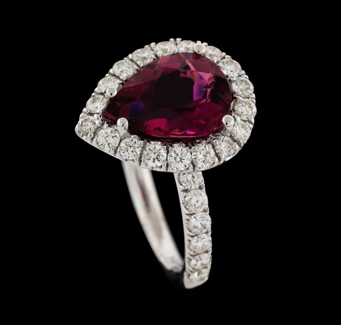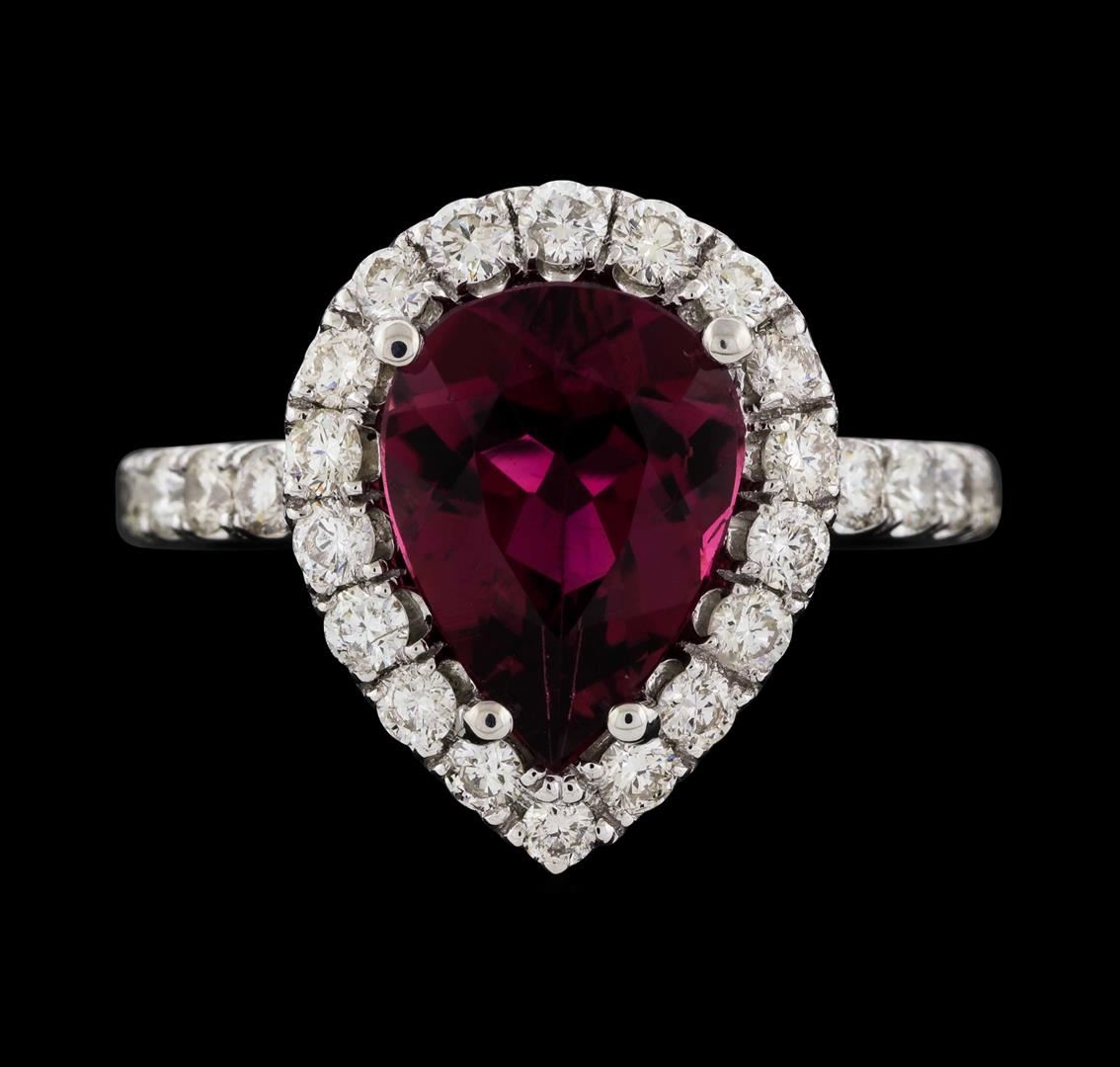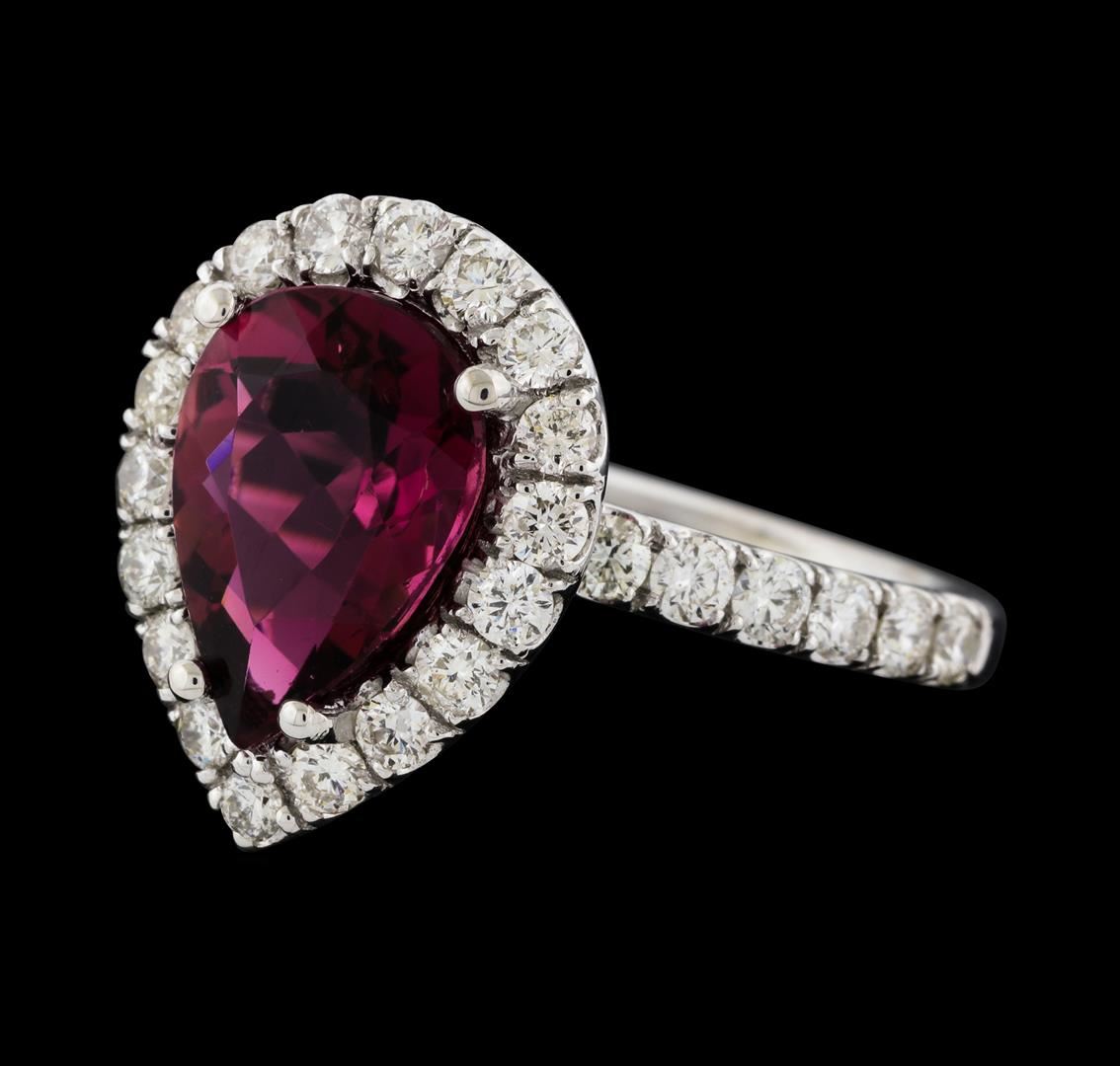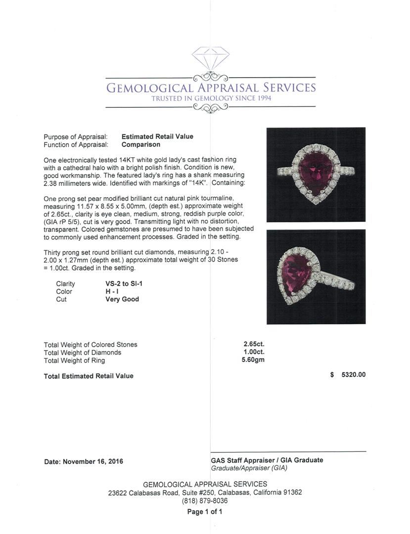 One electronically tested 14KT white gold lady's cast fashion ring with a cathedral halo with a bright polish finish. The featured lady's ring has a shank measuring 2.38 millimeters wide. Identified with markings of '14K'. Condition is new, good workmanship. Containing: One prong set pear modified brilliant cut natural pink tourmaline, measuring 11.57 x 8.55 x 5.00mm, (depth est.) approximate weight of 2.65ct., clarity is eye clean, medium, strong, reddish purple color, (GIA rP 5/5), cut is very good. Transmitting light with no distortion, transparent. Colored gemstones are presumed to have been subjected to commonly used enhancement processes. Graded in the setting. Thirty prong set round brilliant cut diamonds, measuring 2.10 - 2.00 x 1.27mm (depth est.) approximate total weight of 30 Stones = 1.00ct. Graded in the setting. Clarity VS-2 to SI-1. Color: H - I Cut Very Good. Total Weight of Colored Stones 2.65ct.. Total Weight of Diamonds 1.00ct.. Total Weight of Ring 5.60gm. GAS Appraised at $5,320.00.